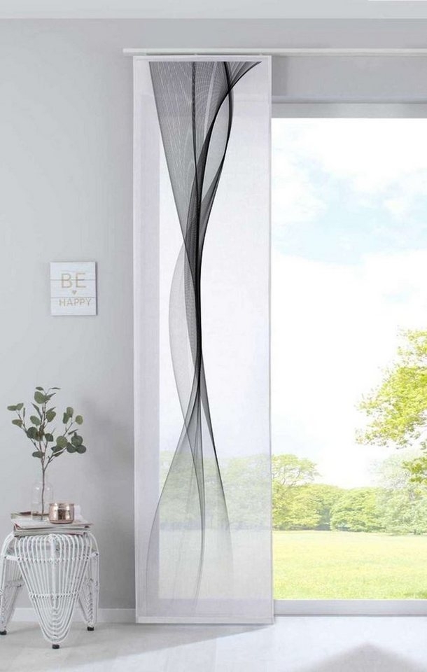 Halbtransparente Schiebegardine »Izmir« mit modernem Wellenmotiv in Schwarz. Diese feinfädige Gardine lässt reichlich Tageslicht in den Raum und bietet gleichzeitig Sichtschutz vor neugierigen Blicken sowie Schutz vor direkter Sonneneinstrahlung. Der Flächenvorhang wird inklusive Schiebepaneel und Beschwerungsstange geliefert und ist einfach mit Klettband zu befestigen. **Highlights** - Halbtransparent: Lässt Tageslicht durch und sorgt für eine angenehme Raumatmosphäre. - Sichtschutz: Schützt vor Blicken von außen. - Pflegeleicht: Waschbar bis 40 Grad. - Einfache Montage: Befestigung mit Klettband für unkomplizierte Handhabung. - Inklusive Beschwerungsstange: Sorgt für einen perfekten Fall des Vorhangs. **Produkteigenschaften** - Maße (HxB): 245 x 60 cm - Farbe: Welle Schwarz - Material: 100 % Polyester - Befestigung: Für Gardinenschienen oder Gardinenstangen mit Innenlauf geeignet - Pflege: Chlorfrei **Lieferumfang** - 1 Schiebevorhang mit Paneelwagen und Beschwerungsstange