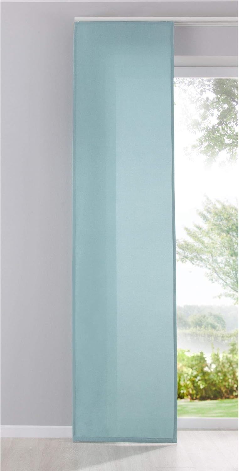 Der Flächenvorhang Cationic von Gardinenbox bringt mit seiner seidenmatten Leinenoptik ein natürliches Wohlfühlambiente in jeden Wohnraum. Der blickdichte Vorhang in der Farbe Aqua sorgt für eine helle und freundliche Raumatmosphäre. Mit einem Stoffmaß von 245x60 cm ist er ideal für moderne und Landhaus-Stil Wohnraumgestaltungen geeignet. **Highlights** - Blickdicht: Schützt vor neugierigen Blicken und sorgt für Privatsphäre. - Pflegeleicht: Waschbar bis 40 Grad für einfache Reinigung. - Leinenoptik: Fügt sich harmonisch in verschiedene Wohnstile ein. - Einfache Befestigung: Mit Flauschband leicht anzubringen und abnehmbar. - Vielseitig: Passend für gängige Deckenschienen mit verschiedenen Gleitsystemen. **Produkteigenschaften** - Farbe: Aqua - Material: 100% Polyester - Maße (HxB): 245x60 cm - Pflegehinweis: Chlorfrei, waschbar bis 40 Grad - Alle Stoffmaße sind Ca.-Maße ohne Falten und Drapierungen **Lieferumfang** - 1 Stück Flächenvorhang Cationic - Befestigung mit Flauschband, Klettschienen, Beschwerungsstangen und Paneelwagen - Passend für gängige Deckenschienen mit 2 verschiedenen Gleitsystemen
