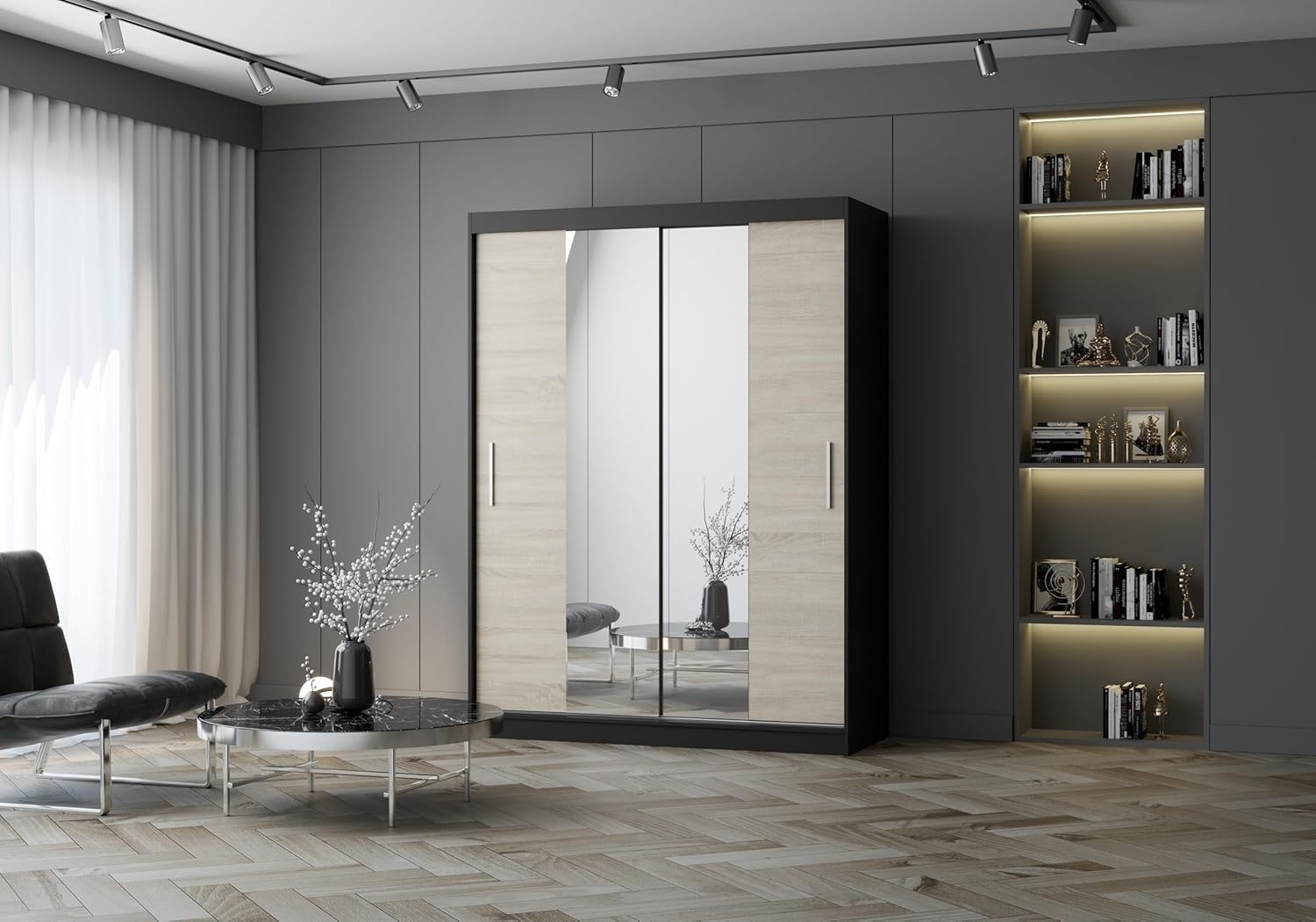 in SchiebetürenschränkeSchiebetürenschrankeleganter Kleiderschrank Schrank Garderobe Spiegel Vista 01, Schlafzimmer- Wohnzimmerschrank Schiebetüren Modern Design (Schwarz/Sonoma)