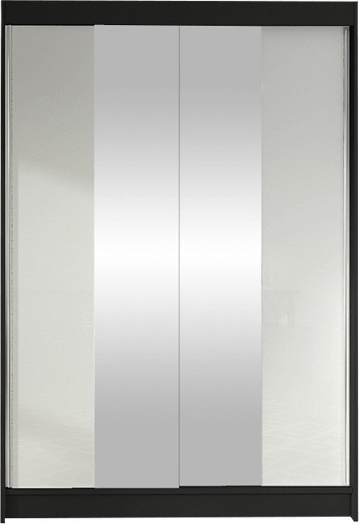 Kleiderschrank Lino II in Schwarz / Weiß bietet mit seinen kompakten Maßen von 120 x 200 x 58 cm viel Stauraum. Der Schiebetürenschrank ist aus 16 mm Laminatplatte gefertigt und verfügt über ein modernes Schiebtürensystem mit Aluminium-Gleitschienen. Ausgestattet mit einem Frontspiegel, einer Kleiderstange und geräumigen Einlegeplatten, vereint er Funktionalität und Stil. **Highlights** - Schiebetürensystem für platzsparende Nutzung - Frontspiegel für eine praktische Ankleidehilfe - Aluminium-Gleitschienen der Firma sevroll – Typ micra für hohe Stabilität - Modernes Design durch Aluminiumleisten als Griffe - Geräumige Einlegeplatten und Kleiderstange für optimalen Stauraum **Produkteigenschaften** - Maße (HxBxT): 200 x 120 x 58 cm - Korpus und Fronten: Laminatplatte 16 mm - ABS-Rand für zusätzliche Stabilität - Lieferung in Paketen mit Montageanleitung zum Selbstaufbau - Lieferung nicht auf Inseln und in Bergbewohnungen **Lieferumfang** - Kleiderschrank Lino II - Montageanleitung - Ohne Dekoration - Beleuchtung LED RGB nicht im Preis enthalten