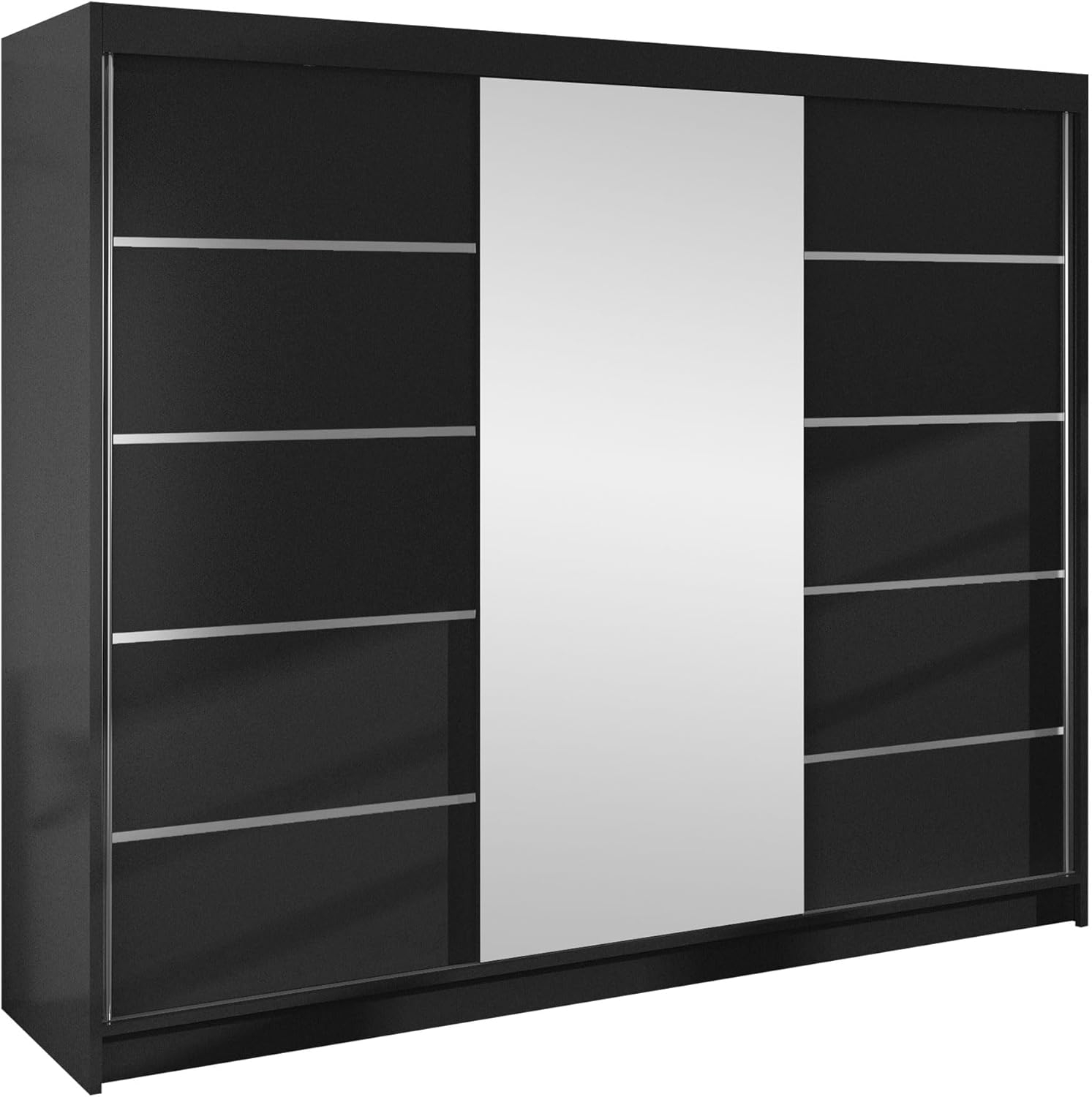 Großer Schiebetürenschrank 'Dotan VI' mit Spiegel in elegantem Schwarz. Der Schrank bietet mit seinen großzügigen Abmessungen von 200 x 215 x 58 cm viel Stauraum und ist ideal für die Aufbewahrung Ihrer Kleidung. Die moderne Ausführung aus 16 mm Laminatplatte und die Aluminiumgriffe sorgen für eine ansprechende Optik und Funktionalität. **Highlights** - Frontspiegel für eine praktische Nutzung - Aluminium-Gleitschienen für eine reibungslose Bedienung - Kleiderstange für zusätzliche Aufbewahrungsmöglichkeiten - Großräumige Regalfächer für optimale Organisation - Modernes Design in mattem Finish **Produkteigenschaften** - Maße (HxBxT): 215 x 200 x 58 cm - Material: Laminatplatte 16 mm, PVC-Rand - Alle Elemente in matt - Griffe in Form von Aluminiumleisten entlang der Tür **Lieferumfang** - Schiebetürenschrank 'Dotan VI' - Montageanleitung zum Selbstaufbau - Lieferung bis zur ersten Tür (kein Montageservice) - Ohne Dekoration