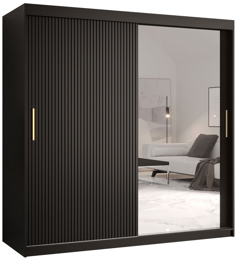 Kleiderschrank Kirtan Slim 2 in elegantem Schwarz bietet mit seinen großzügigen Abmessungen von 180 x 200 x 62 cm ausreichend Stauraum für Ihre Kleidung. Der Schrank besteht aus einer stabilen Laminatplatte und MDF-Platten mit einem modernen Frontspiegel. Ausgestattet mit zwei Kleiderstangen und hochwertigen Aluminium-Gleitschienen, vereint er Funktionalität und stilvolles Design. **Highlights** - Frontspiegel für eine praktische Ankleidehilfe - Zwei Kleiderstangen für optimalen Stauraum - Hochwertige Aluminium-Gleitschienen für sanftes Öffnen und Schließen - Robuste Laminat- und MDF-Platten für Langlebigkeit - Elegantes Design in Schwarz **Produkteigenschaften** - Maße (HxBxT): 200 x 180 x 62 cm - Korpus: Laminatplatte 16 mm - Fronten: MDF-Platte gefräst 18 mm - Rand: PVC - Kunststoffgriffe in Gold **Lieferumfang** - Kleiderschrank Kirtan Slim 2 - Montageanleitung - Lieferung bis zur ersten Tür (nicht auf Inseln und Bergbewohnung) - Ohne Dekoration