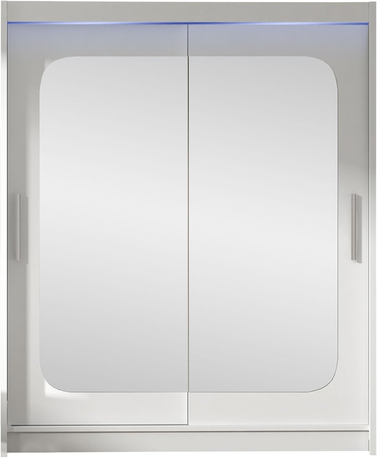Kleiderschrank Westa XII in Weiß mit Spiegel bietet Ihnen großzügigen Stauraum und eine moderne Optik. Mit den Maßen 150 x 200 x 58 cm ist er ideal für Ihr Schlafzimmer. Der Schrank verfügt über Schwebetüren, eine Kleiderstange und großräumige Regale. Die Aluminium-Gleitschienen sorgen für eine reibungslose Handhabung. Bitte beachten Sie, dass die RGB LED Beleuchtung nicht im Preis enthalten ist und separat bestellt werden kann. **Highlights** - Schwebetüren für platzsparendes Öffnen - Frontspiegel für eine praktische Nutzung - Großräumige Regale für optimalen Stauraum - Aluminium-Gleitschienen für reibungslosen Betrieb - Silberne Griffe aus Kunststoff für einen modernen Look **Produkteigenschaften** - Maße (HxBxT): 200 x 150 x 58 cm - Korpus und Fronten: Laminatplatte 16 mm - Mit Kleiderstange - Silberne Griffe (Länge: 20 cm) - RGB LED Beleuchtung nicht im Preis enthalten (15 veränderbare Farben + Fernbedienung) **Lieferumfang** - Kleiderschrank Westa XII - Montageanleitung zum Selbstaufbau - Lieferung bis zur ersten Tür - Lieferung nicht auf Inseln und in Bergbewohnungen - Ohne Dekoration