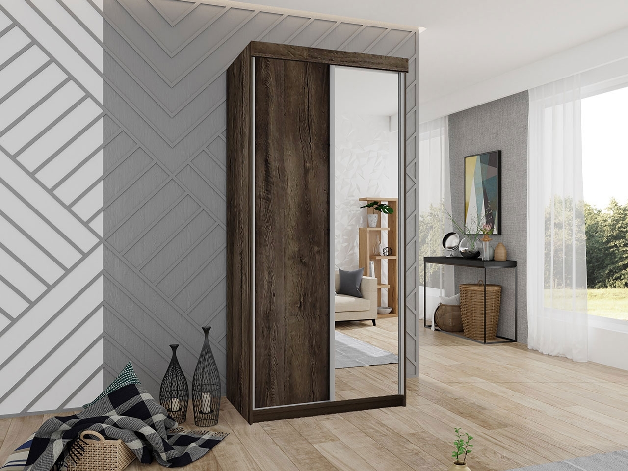 Kleiderschrank Toplo 23/100 in Esche Dunkel überzeugt durch modernes Design und hochwertige Verarbeitung. Mit den Maßen 100 x 200 x 62 cm bietet er ausreichend Stauraum. Der Schrank ist aus 16 mm Laminatplatte gefertigt und verfügt über ein Kugellagersystem aus Aluminium sowie solide Aluminiumgriffe. Eine Kleiderstange und Einlegeplatten sind ebenfalls enthalten. Bitte beachten Sie, dass die LED-Beleuchtung nicht im Lieferumfang enthalten ist. **Highlights** - Schwebetürenschrank mit Spiegel - Modernes Design - Hochwertige Qualität - Kugellagersystem aus Aluminium - Solide Aluminiumgriffe **Produkteigenschaften** - Maße (HxBxT): 200 x 100 x 62 cm - Material: Laminatplatte 16 mm - Geklebt mit PVC - Metallgleitschienen der Firma Laguna - Rollen Laguna, Unten Kugellager, System Fast - Eine Frontplatte mit 3 mm starkem Spiegel **Lieferumfang** - Kleiderschrank Toplo 23/100 - Montageanleitung zum Selbstaufbau - Lieferung bis zur ersten Tür - Ohne LED-Beleuchtung und Dekoration