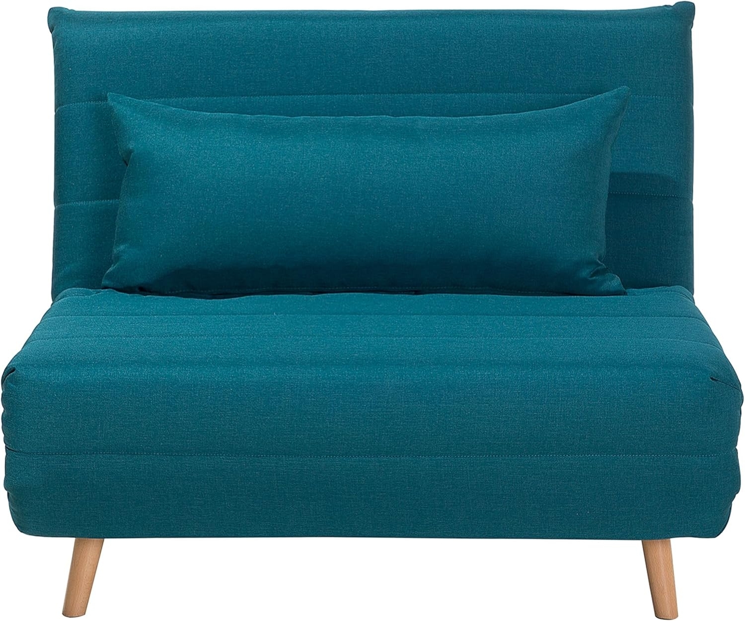 Schlafsofa Polsterbezug seeblau SETTEN ist ein trendiges Polstersofa mit Schlaffunktion und verstellbarer Rückenlehne. Es bietet eine komfortable und platzsparende Lösung für Ihr Zuhause. Die tiefe Sitzfläche und die dicke Polsterung sorgen für höchsten Komfort, während das Sofa mit wenigen Handgriffen in ein geräumiges Bett verwandelt werden kann. Der Bezug des Zierkissens ist abzieh- und waschbar. **Highlights** - Spielend leicht zu einem Bett konvertierbar - Dicke Polsterung für größten Komfort - Abnehmbare und waschbare Kissenbezüge - Rundumbezug, daher frei im Raum stellbar - Schutzkappen zum Schutz des Bodens **Produkteigenschaften** - Typ: Einzelsofa - Stil: Retro - Farbe: Seeblau - Material: Polyester - Zusätzliches Material: Birkenholz - Füllmaterial: Schaumstoff - Sitzkonstruktion: Wellenfederung - Schaumstoffdichte: 50 kg/m³ - Anzahl Sitzplätze: 1 Person - Schlaffunktion: Ja - Öffnungsmechanismus: Zum Ausklappen - Abmessungen (HxBxT): 82 x 104 x 90/190 cm - Sitzhöhe: 42 cm - Dicke der Polsterauflagen: 28 cm - Liegefläche: 190x104 cm - Gewicht: 28 kg - Max. Belastung p.P: 150 kg **Lieferumfang** - 1 x Sofa - 1 x Zierkissen