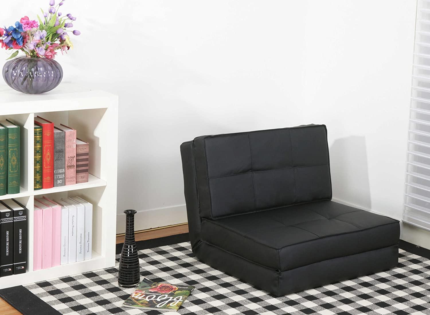 Sessel mit Bettfunktion "Das Möbelstück für alle Ansprüche". Dieser trendige Sessel gefällt nicht nur durch sein schlichtes, formschönes Design, sondern kann auch mit seiner Flexibilität punkten: Als Sessel: 5-Einstellungsstufen der Rückenlehne sorgen für eine angenehme Anpassung der Rückenposition. Als Gästebett: Dieser Sessel lässt sich innerhalb weniger Handgriffe zu einer äußerst bequemen Liegefläche aufklappen. Bei nicht aufgeklapptem Kopfteil hat man gleich ein integrierten bequemes Kopfkissen bei immer noch ausreichender Liegefläche von über 190 cm Länge. Spontane Besuche stellen Sie somit vor keinerlei Probleme. Der Sessel besitzt dank der Leichtbauweise ein geringes Eigengewicht. Die schmale Abmessung ermöglicht Ihnen bei Nichtgebrauch des Sessels leichte Verstaumöglichkeiten. Die Kunstlederbezüge lassen sich einfach mittels Reißverschlüssen abnehmen, sie sind pflegeleicht und abwaschbar Wer vorwiegend ein Gästebett sucht, ist beim kleinen Sessel richtig, als Bett hat er über 2 Meter Liegefläche und eignet sich für Kinder und Jugendliche auch gut zum Sitzen, Chillen und Chatten. Sessel klein - Breite 74 cm - Tiefe ca. 74 cm - Lehnenhöhe vom Boden 61 cm - Sitzhöhe ca. 22 cm - Tiefe der Sitzfläche 46 cm - Liegefläche 74x212 cm **Material**: Kunstlederbezug, Metallrahmen, PU-Schaum.