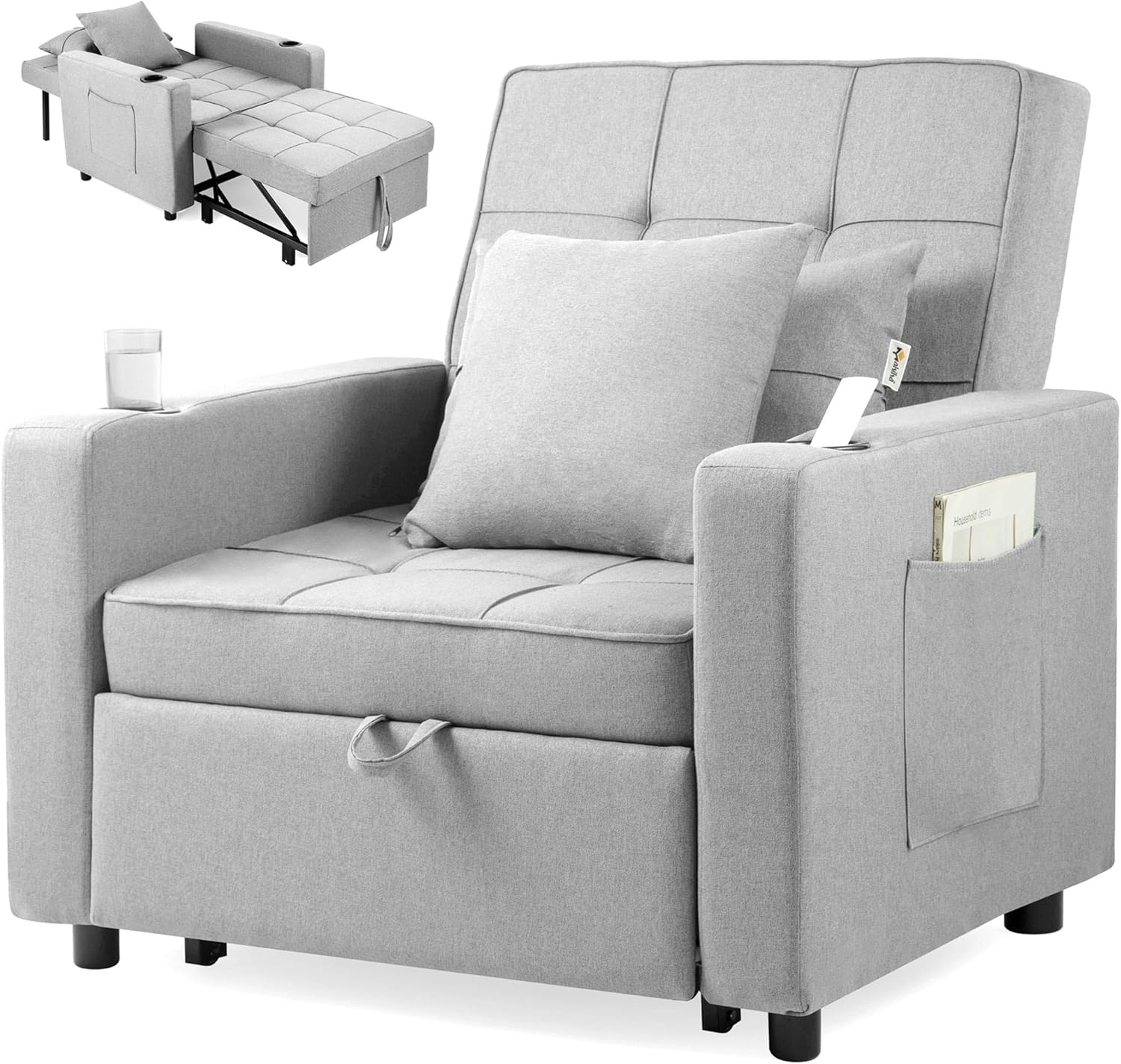 Makika Schlafsessel Schlafstuhl Tommy klappbar in Hellgrau ist die ideale Lösung für begrenzte Platzverhältnisse. Dieser vielseitige 3in1 Schlafsessel lässt sich mühelos in eine Liege oder ein Bett verwandeln. Mit einer Rückenlehne, die in 6 Stufen verstellbar ist, und praktischen Details wie Getränkehaltern und Seitentaschen, bietet er hohen Komfort und Funktionalität. Der strapazierfähige Bezug und das moderne Design machen ihn zu einem attraktiven Möbelstück für jedes Zuhause. **Highlights** - 3in1 Schlafsessel: Flexibel einsetzbar als Schlafsessel, Schlafliege oder Schlafbett - Getränkehalter: Eingebaute Halterungen für Gläser und Dosen, leicht zugänglich - Modernes Design: Passt sich jedem Wohnstil an und ist vielseitig einsetzbar - 2 Kissen: Unterstützen den Rücken und sorgen für zusätzlichen Komfort - Pflegeleicht: Abnehmbare Kissenbezüge für einfache Reinigung **Produkteigenschaften** - Material: Stahlrohre, Leinen, Schaumstoff - Material Bezug: Stoff (100% Polyurethanfaser) - Maße als Sofa: 75 x 91 x 95 cm (LxBxH) - Maße als Bett: 189 x 91 x 58 cm (LxBxH) - Rückenlehne in 6 Stufen einstellbar - Klappbar - 2 Seitentaschen zur Aufbewahrung - Gewicht: 35 kg - Max. Belastbarkeit: 150 kg **Lieferumfang** - 1 Schlafsessel - 2 Kissen - Bezug abnehmbar für leichte Reinigung