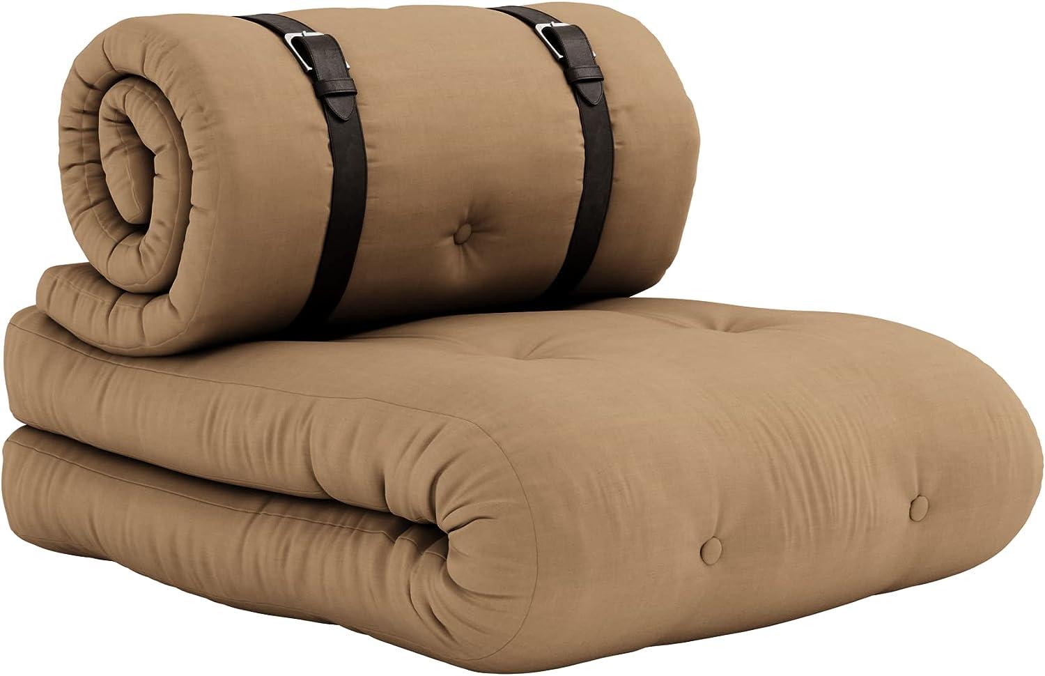 Karup Design Futonsessel BUCKLE UP Mocca vereint Funktionalität und Stil. In nur drei Schritten verwandeln Sie diesen Sessel von einer bequemen Sitzgelegenheit in eine komfortable Schlafgelegenheit. Mit einer Liegefläche von 70 x 200 cm und zwei Futonmatratzen bietet er gepolsterten Komfort für die Nacht. Der Bezug in Mocca und der Ledergürtel in Braun/Silber runden das ansprechende Design ab. **Highlights** - Multifunktional: Verwandelt sich schnell von einem Sessel in ein Bett - Breitere und dickere Futons für zusätzlichen Komfort - Einfache Handhabung durch aufrollbare Rückenlehne - Stilvolles Design, das den Lebensraum maximiert - Pflegeleicht: Reinigung mit trockenem Tuch **Produkteigenschaften** - Liegefläche: 70 x 200 cm - Futonmatratzen: 5 x 70 x 200 cm und 12 x 70 x 200 cm - Bezugfarbe: Mocca - Gürtel: Braun/Silber - Material Matratze: 80 % Baumwolle / 20 % Polyester - Dicke Matratze: 5 cm (mit 2 cm Schaumstoffkern) und 12 cm (mit 4 cm Schaumstoffkern) - Bezug nicht abnehmbar **Lieferumfang** - Futonsessel BUCKLE UP Mocca - 2 Futonmatratzen - Ledergürtel - Lieferung ohne Deko