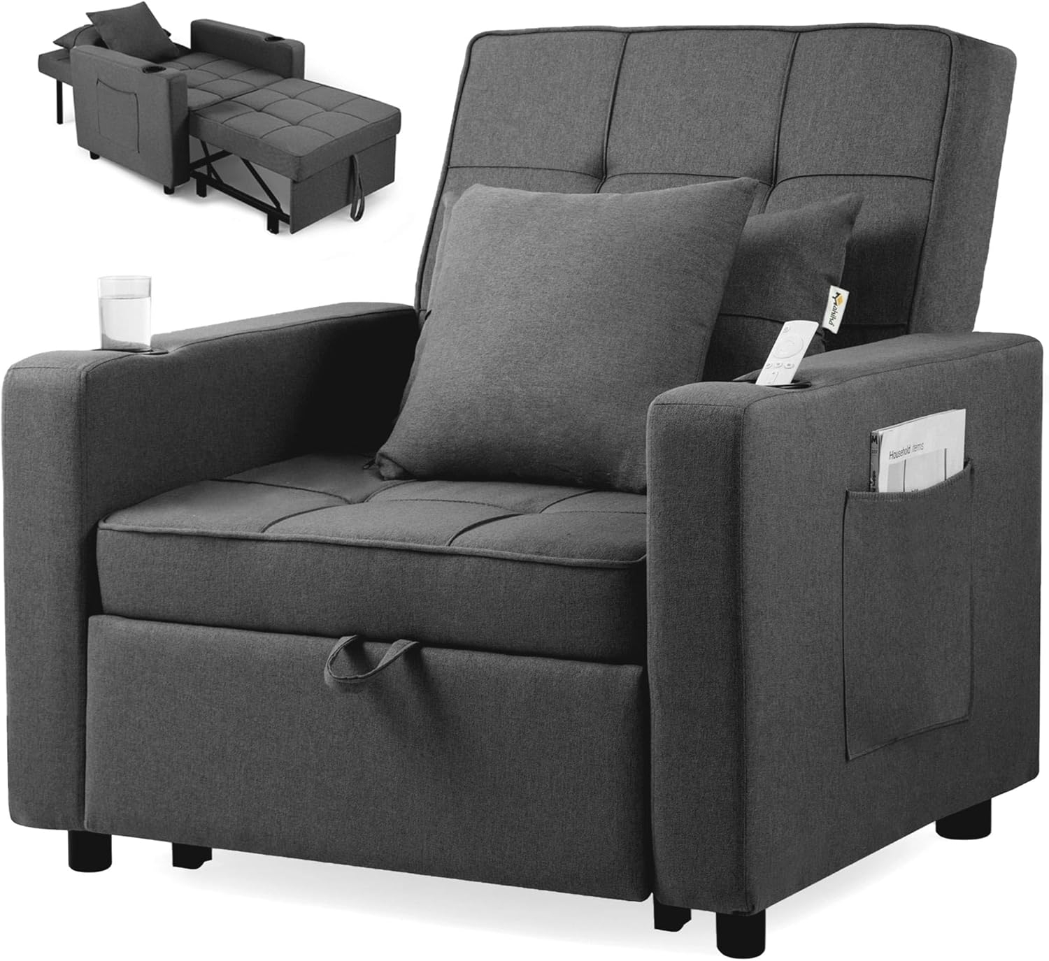 Der Makika 'Tommy' Schlafsessel ist ein vielseitiges 3in1-Möbelstück in Dunkelgrau, das sich mühelos in einen Schlafstuhl oder ein Bett verwandeln lässt. Mit einer Rückenlehne, die in 6 Stufen verstellbar ist, und zwei praktischen Getränkehaltern bietet er hohen Komfort. Der strapazierfähige Bezug aus 100% Polyurethanfaser und die robusten Materialien garantieren Langlebigkeit. Ideal für Gäste- oder Jugendzimmer, vereint er Funktionalität und modernes Design. **Highlights** - 3in1 Schlafsessel: Flexibel einsetzbar als Schlafsessel, Schlafliege oder Schlafbett - Getränkehalter: Eingebaute Halterungen für Gläser und Dosen, leicht zugänglich - Modernes Design: Passt sich jedem Wohnstil an und ist vielseitig einsetzbar - Inkl. 2 Kissen: Unterstützen den Rücken und sorgen für zusätzlichen Komfort - Pflegeleicht: Abnehmbare Kissenbezüge für einfache Reinigung **Produkteigenschaften** - Material: Stahlrohre, Leinen, Schaumstoff - Material Bezug: Stoff (100% Polyurethanfaser) - Maße als Sofa: 75 x 91 x 95 cm (LxBxH) - Maße als Bett: 189 x 91 x 58 cm (LxBxH) - Rückenlehne in 6 Stufen einstellbar - Klappbar - 2 Seitentaschen zur Aufbewahrung - Gewicht: 35 kg - Max. Belastbarkeit: 150 kg **Lieferumfang** - 1x Schlafsessel - 2x Kissen - Bezug der Kissen abnehmbar