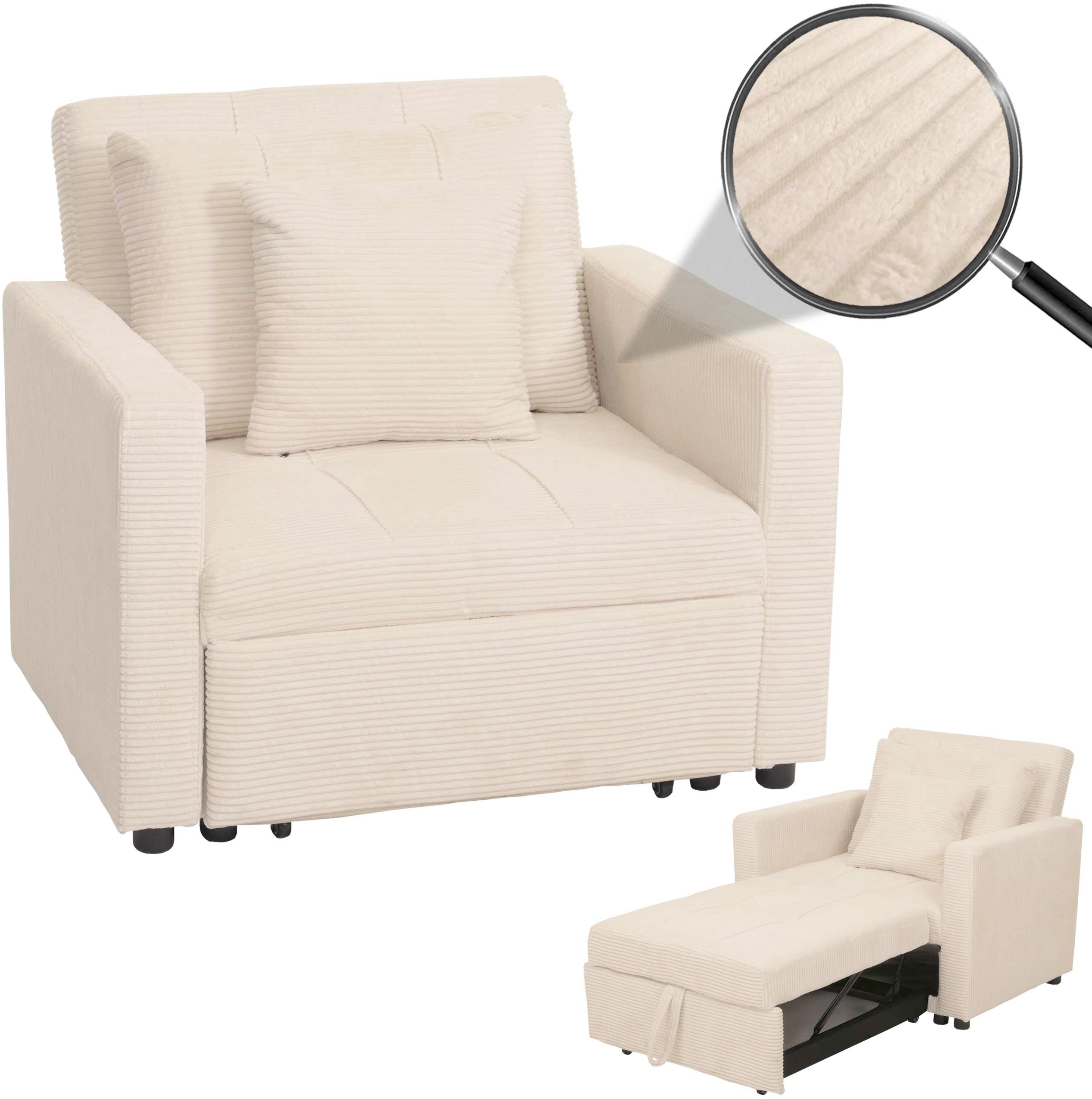 - Inklusive Kissen - Mit Schlaffunktion - Moderner Cord-Stoffbezug - Mit Armlehnen - Als Sessel, Liege und Bett verwendbar (ausziehbar) - Rückenlehne in 3 Positionen verstellbar - Maximale Dauerbelastbarkeit: 150 kg - Diese moderne Couch sieht nicht nur gut aus, sondern lässt sich mit nur wenigen Handgriffen zu einem bequemen Schlafplatz für Sie oder Ihre Gäste umwandeln. Entspannen Sie in Stil und Komfort mit diesem vielseitigen Schlafsessel. - Dank des eleganten Designs fügt sich dieses Klappsofa nahtlos in jede Umgebung ein und wird immer zu einem Blickfang. Die bequeme Polsterung lädt zum Relaxen ein. Perfekt für einen entspannten Fernsehabend mit den Liebsten. Maße (HxBxT) (ca.): Gesamt Sessel: 62-86x100x88 cm Gesamt Bett: 40x66x197 cm Sitzfläche: 40x66x63 cm Höhe Rückenlehne (vom Sitz aus gemessen): 50 cm Höhe Armlehne (vom Sitz aus gemessen): 22 cm Polsterdicke: 10 cm Material: Rahmen: 80% Eukalyptus Holz + 20% Eisen Bezug: Stoff/Textil Cord (100% Polyester) Polsterung: Schaumstoff (100% Polyurethan) Füße: Kunststoff Entdecken Sie den vielseitigen Schlafsessel, der Ihr Zuhause in eine Oase der Entspannung und Funktionalität verwandelt. Dieser Klappsessel kombiniert die Gemütlichkeit eines Relaxsessels mit der praktischen Schlaffunktion eines Gästebetts und bietet dabei eine großzügige Liegefläche von 197x100 cm. Mit seinem hochwertigen Cordbezug aus weichem Stoff verleiht dieser Sessel jedem Raum eine elegante und einladende Atmosphäre. Dank der robusten Konstruktion hält der Sessel einer maximalen Dauerbelastbarkeit von bis zu 150 kg stand, was ihn zu einer langlebigen und zuverlässigen Wahl macht. Die integrierten Armlehnen sorgen für zusätzlichen Komfort, während die Rückenlehne in drei Positionen verstellbar ist, sodass Sie jederzeit die perfekte Sitz- oder Liegeposition finden können. Egal, ob Sie den Sessel zum Entspannen, Lesen oder Schlafen nutzen möchten – dieser Schlafsessel passt sich Ihren Bedürfnissen an. Mit nur wenigen Handgriffen verwandeln Sie den Sessel in eine bequeme Liege oder ein vollwertiges Bett, ideal für Gäste oder entspannte Fernsehabende. Das im Lieferumfang enthaltene Kissen rundet das Komforterlebnis ab und macht den Schlafsessel zu einem echten Wohlfühlmöbelstück. Nutzen Sie ihn als stilvollen Sessel im Wohnzimmer, als praktische Liege im Gästezimmer oder als bequemes Bett für unerwartete Übernachtungsgäste – dieser Schlafsessel erfüllt all Ihre Ansprüche an Flexibilität und Komfort. Das Ambiente-Bild zeigt auch das Zubehör, Beistelltisch HWC-A80 und Teppich HWC-F69, welches nicht mitgeliefert wird. Animation zeigt die Schlaffunktion: