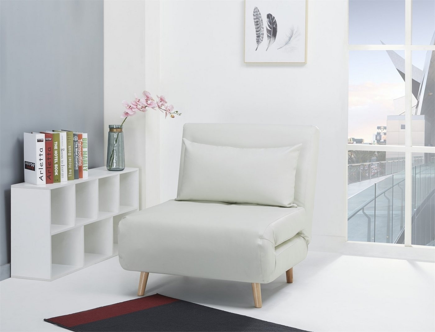 Der Artdeco Schlafsessel klein in Weiß kombiniert stilvolles Design mit praktischer Funktionalität. Er lässt sich flexibel als Sessel und Gästebett nutzen und bietet mit einer Liegefläche von über 190 cm ausreichend Platz für erholsamen Schlaf. Die Rückenlehne ist in drei Positionen verstellbar, während der pflegeleichte Kunstlederbezug und der stabile Metallrahmen für Langlebigkeit sorgen. **Highlights** - 3-Einstellungsstufen der Rückenlehne für individuelle Anpassung - Schnelles Aufklappen zur bequemen Liegefläche - Unsichtbare Zusatzbeine für eine elegante Optik - Ausreichende Liegefläche von über 190 cm Länge - Pflegeleichte und abwaschbare Bezüge **Produkteigenschaften** - Breite: 77 cm - Höhe: 81 cm - Tiefe: 90 cm - Sitzhöhe: 42 cm - Sitztiefe: 52 cm - Liegefläche: 77 x 192 cm - Kunstlederbezug - Metallrahmen - PU-Schaum Polsterdicke: ca. 11 cm