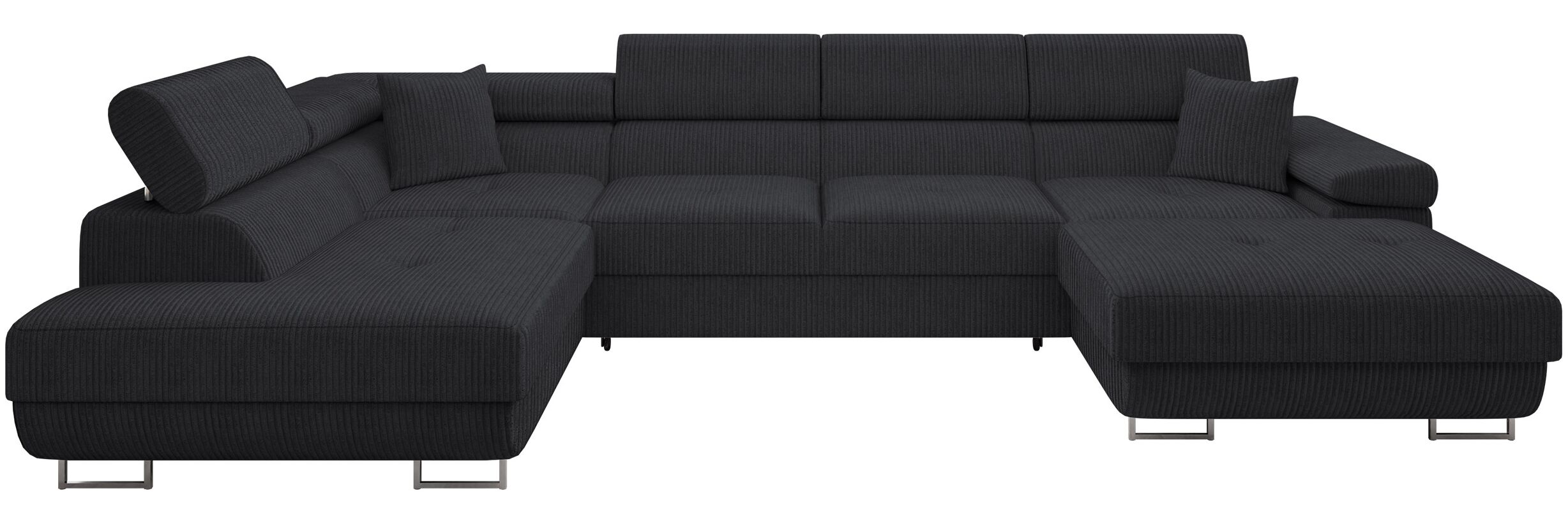 Ecksofa Torezio Bis Cord bietet Ihnen eine komfortable Schlaffunktion und einen praktischen Bettkasten. Mit einer Länge von 346 cm, einer Breite von 203 cm und einer Höhe von 70 bis 90 cm ist es ideal für Ihr Wohnzimmer. Die Schlaffläche misst 268 x 124 cm und der Bettkasten hat die Maße 173 x 92 x 17 cm. Die verstellbaren Kopfstützen und die hochwertige Polsterung sorgen für zusätzlichen Komfort. **Highlights** - Schlaffunktion für zusätzlichen Schlafplatz - Praktischer Bettkasten für Stauraum - Einstellbare Kopfstützen für individuellen Komfort - Freistehendes Design mit echt bezogenem Rücken - Robuste Konstruktion aus Holz und hochwertigen Materialien **Produkteigenschaften** - Maße (L x B x H): 346 x 203 x 70 - 90 cm - Schlaffläche: 268 x 124 cm - Bettkasten Größe: 173 x 92 x 17 cm - Sitzfläche: Holz, Wellenfeder, Filz, Schaumstoff T-2844 (Dicke: 10 cm), Polsterwatte - Lehne: Holz, Faserplatte, Schaumstoff T-2844 (Dicke: 8 cm), Polsterwatte - Vorderfüße: Metall Chrom, Hinterfüße: Kunststoff (Höhe: 9 cm) - Polsterlehnen fest montiert **Lieferumfang** - Ecksofa Torezio Bis Cord - Ohne Dekoration