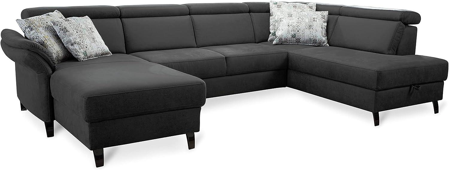 Beschreibung Die Cavadore Wohnlandschaft Ammerland vereint modernen Stil mit hohem Sitzkomfort. Ausgestattet mit einem Federkern und flexibel verstellbaren Kopfteilen, bietet sie optimalen Komfort. Der pflegeleichte Bezug aus Mikrofaser "Taurus" in Lederoptik in Dunkelgrau sorgt für eine ansprechende Optik. Mit den Maßen 317 x 84 x 193 cm (BxHxT) und einer Liegefläche von 117 x 251 cm ist sie ideal für entspannte Stunden. **Highlights** - Federkern für hohen Sitzkomfort - Flexibel verstellbare Kopfteile - Pflegeleichter Bezug aus Mikrofaser "Taurus" - Liegefläche von 117 x 251 cm - Moderne Sofalandschaft frei im Raum stellbar **Produkteigenschaften** - Maße (BxHxT): 317 x 84 x 193 cm - Sitzhöhe: 48 cm - Sitztiefe: 51 cm - Wellenunterfederung für Langlebigkeit - Metallfuß in Nickel Schwarz **Lieferumfang** - 5432 - Wohnlandschaft Ammerland mit Federkern - Longchair links - 2,5-sitziges Sofa mit Bettfunktion - Ottomane rechts - Inkl. Kopfteilverstellung