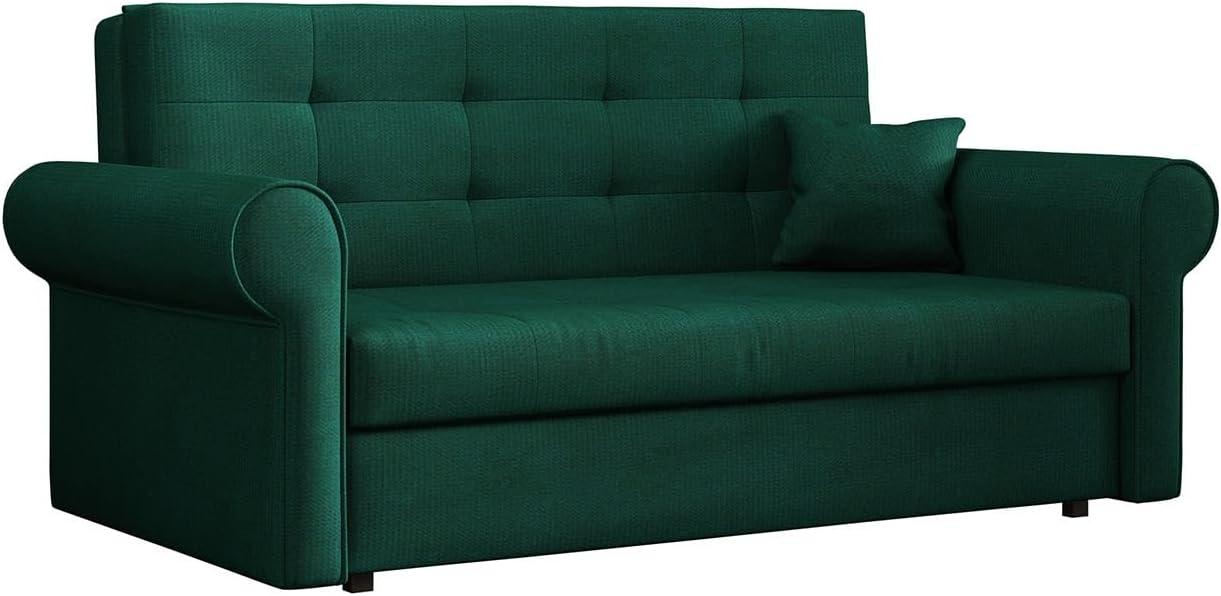 Das Mirjan24 'Viva Silver III' Schlafsofa in Grün vereint elegantes Design mit praktischen Funktionen. Mit einer Länge von 168 cm, einer Breite von 98 cm und einer Höhe von 85 cm bietet es nicht nur Platz zum Sitzen, sondern auch eine großzügige Schlaffläche von 196 x 132 cm. Der integrierte Bettkasten mit den Maßen 129 x 66 x 19 cm sorgt für zusätzlichen Stauraum. **Highlights** - Ausziehbares Sofa mit Schlaffunktion für flexible Nutzung - Integrierter Bettkasten für zusätzlichen Stauraum - Freistehendes Design mit überzogenem Rücken - Hochwertige Holzkonstruktion für Stabilität - Kissen im Preis enthalten **Produkteigenschaften** - Maße (HxBxT): 85 x 98 x 168 cm - Schlaffläche: 196 x 132 cm - Bettkasten: 129 x 66 x 19 cm - Material: Holzkonstruktion (Kiefernholz) + Spanplatte - Sitzfläche: Schaumstoff T25/42 + Wellenfeder - Lehne: Schaumstoff T25/42 - Schwarze Metallfüße - Polsterlehnen fest montiert - Kissen ohne Reißverschluss **Lieferumfang** - 1x Schlafsofa 'Viva Silver III' - Kissen (1 Stück) im Preis enthalten - Lieferung erfolgt nicht auf Inseln und in Bergbewohnungen - Dekoration nicht enthalten