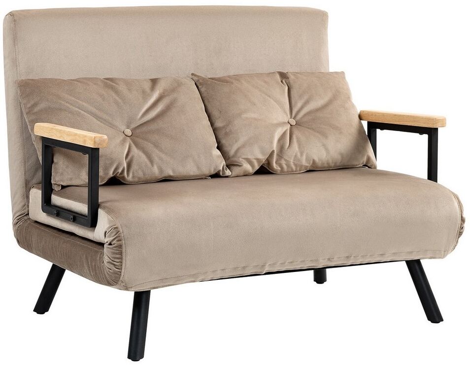 Entdecken Sie das HOMCOM Schlafsofa, das sich mühelos von einem stilvollen Sessel in ein komfortables Gästebett verwandelt. Mit einem stabilen Stahlrahmen und einer fünffach verstellbaren Rückenlehne bietet es sowohl tagsüber als auch nachts optimalen Komfort. Der samtweiche Bezug und die üppige Polsterung sorgen für ein außergewöhnliches Sitzerlebnis. Ideal für Ihr Wohnzimmer oder als praktisches Gästebett. **Highlights** - Vielseitig einsetzbar: Sessel und Gästebett in einem - Rückenlehne in 5 Stufen verstellbar (100°, 120°, 140°, 160°, 180°) - Stabiler Stahlrahmen garantiert Standfestigkeit und Langlebigkeit - Pflegeleichter Bezug des Kissens ist abnehmbar und waschbar - Elegante Armlehnen aus Kautschukbaumholz **Produkteigenschaften** - Farbe: Hellbraun - Material: Stahl, Schaumstoff, Polyester, Kautschukbaumholz - Sofa Größe: 102B x 73T x 81H cm - Bett Größe: 183B x 98,5T x 26H cm - Sofa Sitz Größe: 95B x 57T x 37H cm - Bett Liegefläche Größe: 183B x 98T x 9H cm - Sitzdicke: 20 cm - Rückenlehne Größe: 48B x 98T x 9H cm - Kissen Größe: 50B x 33T x 11H cm - Armlehne Größe: 36B x 3,5T cm - Höhe der Armlehne (vom Sitz aus): 15 cm - Belastbarkeit: 120 kg **Lieferumfang** - 1 x Schlafsofa - 1 x Kopfkissen - 1 x Anleitung