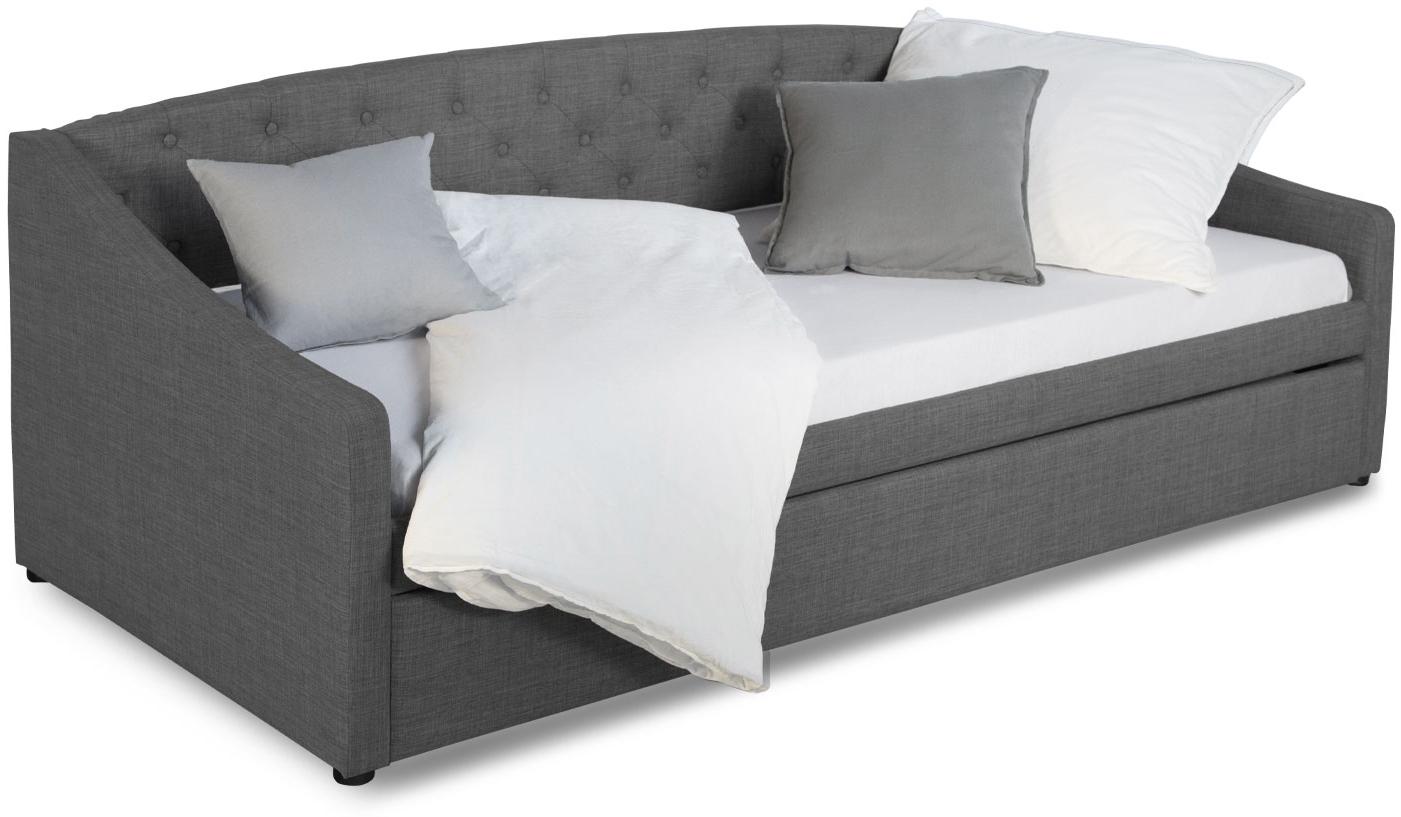 **Produktbeschreibung:** Praktisch, funktional und stilvoll. Das graue Tagesbett mit bequemen Polsterbezug ist ideal für das Gästezimmer oder Jugendzimmer geeignet. Durch die Ausziehfunktion kann auch spontaner Übernachtungsbesuch leicht untergebracht werden. Die zwei Liegeflächen ermöglichen ein gemütliches Beisammensein. Ebenfalls kann das Polsterbett mit großen Kissen in eine wohnliche Couch umgewandelt werden. Das graue Funktionsbett mit einer Liegefläche von 90x200 cm wird mit einem passenden Lattenrollrost verschickt. Die Rückenlehne ist mit abgesteppten Knöpfen versehen und verleiht dem Schlafsofa eine besondere Note. **Details:** - modernes graues Ausziehbett inklusive Lattenrost - bequeme abgesteppte Rückenlehne - inklusive 2. herausziehbarer Liegefläche - Bettauszug ideal als Gästebett oder Bettkasten nutzbar - Auszug auf leichtgängigen Kunststoffrollen gelagert - komfortable Liegefläche von 90x200 cm - ein eigenes Lattenrost kann ebenfalls verwendet werden - leicht zu montieren **Material und Farbe:** - Stofffarbe Polster Grau, 100 % Polyester - Polsterbezug strukturiert in hellgrauen Farbnuancen - Lattenrost aus Kiefernholz **Maße:** - Liegefläche (B x T): 90x200 cm - Bett Außenmaß (B x T): 100x215 cm - Liegefläche Auszug: (B x T): 90x200- Höhe Frontbrett Bettkasten: 23 cm - Höhe Seitenteil hinten: 74 cm - Höhe Seitenteil vorn: 51 cm - Einlegetiefe Matratze 2,5 cm - Max. Höhe der unteren Matratze: 16 cm - Materialstärke: 20 mm **Lieferumfang:** - Bettgestell mit Lattenrost (2 Stück), Rollauszug für Gästebett, Anleitung - Dekoration und Matratze sind nicht im Lieferumfang enthalten **Lieferzustand:** - Montage erforderlich - Lieferung erfolgt in 2 Paketen (1 per Spedition und 1 per Paketdienst)