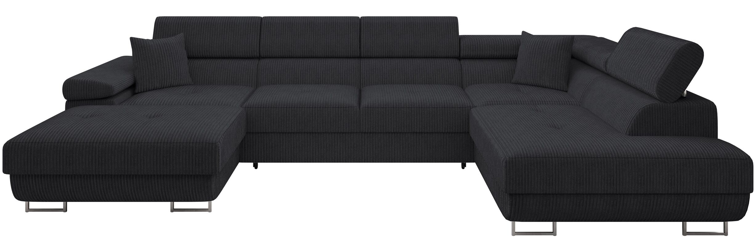 Ecksofa Torezio Bis Cord bietet Ihnen eine komfortable Schlaffunktion und einen praktischen Bettkasten. Mit einer Länge von 346 cm und einer Breite von 203 cm ist es ideal für Ihr Wohnzimmer. Die Höhe variiert zwischen 70 cm und 90 cm. Die Schlaffläche misst 268 x 124 cm, während der Bettkasten eine Größe von 173 x 92 cm und eine Höhe von 17 cm hat. Die verstellbaren Kopfstützen sorgen für zusätzlichen Komfort. **Highlights** - Schlaffunktion für zusätzlichen Schlafplatz - Praktischer Bettkasten zur Aufbewahrung - Einstellbare Kopfstützen für individuellen Komfort - Freistehendes Design mit echtem Rückenbezug - Robuste Konstruktion mit Holz und Schaumstoff **Produkteigenschaften** - Maße (L x B x H): 346 x 203 x 70 - 90 cm - Schlaffläche: 268 x 124 cm - Bettkasten Größe: 173 x 92 x 17 cm - Vorderfüße: Metall Chrom, Hinterfüße: Kunststoff (Höhe: 9 cm) - Sitzfläche: Holz, Wellenfeder, Filz, Schaumstoff T-2844 (Dicke: 10 cm), Polsterwatte - Lehne: Holz, Faserplatte, Schaumstoff T-2844 (Dicke: 8 cm), Polsterwatte - Polsterlehnen fest montiert **Lieferumfang** - Ecksofa Torezio Bis Cord - Montageanleitung (Montage durch den Kunden erforderlich) - Lieferung nicht auf Inseln und in Bergbewohnungen - Ohne Dekoration