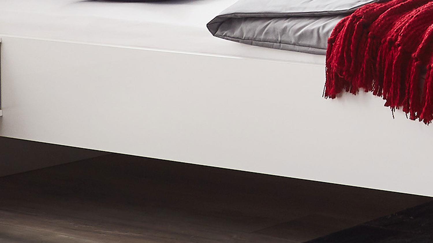 Die Bettanlage VALENCIA in Weiß und Glas Grey mit LED-Beleuchtung vereint modernes Design und Gemütlichkeit. Das gepolsterte Kopfteil in Graphit sorgt für hohen Komfort, während die stimmungsvolle LED-Beleuchtung hinter den Glasabsetzungen eine angenehme Atmosphäre schafft. Zwei Nachtschränke mit Schubkasten bieten praktischen Stauraum. Die großzügige Liegefläche von 180 x 200 cm bietet ausreichend Platz für erholsame Nächte. Made in Germany. **Highlights** - LED-Beleuchtung für stimmungsvolle Atmosphäre - Gepolstertes Kopfteil für zusätzlichen Komfort - Zwei praktische Nachtschränke mit Schubkasten - Großzügige Liegefläche von 180 x 200 cm - Modernes Design in Weiß, Glas Grey und Graphit **Produkteigenschaften** - Material: Holzspanwerkstoff - Front und Korpus: Weiß - Absetzungen: Glas Grey - Kopfteilpolster: Kunstleder (100% Polyurethan), Graphit - Maße (B/H/T): ca. 302 x 92 x 210 cm - Liegefläche: ca. 180 x 200 cm - Qualitätsmerkmale: Kopfteil gepolstert, LED-Beleuchtung, Made in Germany **Lieferumfang** - 1x Futonbett mit LED-Beleuchtung - 2x Nachtschrank mit je einem Schubkasten - Zerlegte Ware mit Aufbauanleitung - Kommode, Matratze, Lattenrost, Beimöbel und Dekoration nicht im Lieferumfang enthalten