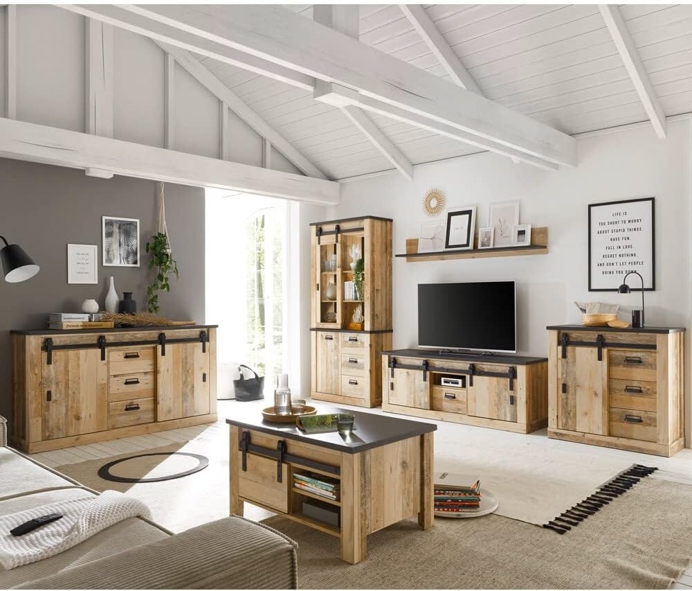 ## Wohnzimmer Komplett Set SHELTON-61 in Old Style hell Nb. mit anthrazit **Materialdaten | Oberflächen:** * Korpus / Front: Qualitätsspanplatte mit Melaminharzbeschichtung * Dekor / Farbe: Old Style hell Nb. * Absetzungen: anthrazit * Griffe: Muschelgriffe Metall * Beschläge und Scharniere: Metall * LED Holzbodenbeleuchtung **Lieferumfang | Produktinformation | Maßangaben:** * 1x Wohnzimmer Komplett Set bestehend aus: * 1 Kommode mit 1 Schiebetür mit hochwertigen Scheunentorbeschlägen, 3 Schubladen, je max. 3 kg, Softclose Funktion, 2 verstellbaren Böden, je max. 5 kg, Gesamtmaß B/H/T: ca. 93/91/43 cm * 1 Lowboard mit 2 Schiebetüren mit hochwertigen Scheunentorbeschlägen, 1 Schublade, Softclose Funktion, max. 3 kg, 1 offenem Fach, max. 10 kg, 2 verstellbare Böden, je max. 5 kg, Gesamtmaß B/H/T: ca. 162/61/43 cm * 1 Regal mit 1 Ablageboden, max. 3 kg, Gesamtmaß B/H/T: ca. 160/30/22 cm * 1 Couchtisch 1 Schiebetür mit hochwertigen Scheunentorbeschlägen, 2 offene Fächer, je max. 10 kg, 2 festen Böden, je max. 10 kg, Gesamtmaß B/H/T: ca. 93/51/60 cm * 1 Vitrine mit 1 Schiebetür mit Glaseinsatz und hochwertigen Scheunentorbeschlägen, 1 Drehtür, Softclose Funktion, 3 Schubladen, je max. 3 kg, Softclose Funktion, 3 offenen Fächern, je max. 5 kg, 6 verstellbaren Böden, je max. 5 kg, 4`,er LED Holzbodenbeleuchtung, Gesamtmaß B/H/T: ca. 93/201/38 cm * 1 Sideboard mit 2 Schiebetüren mit hochwertigen Scheunentorbeschlägen, 3 Schubladen, je max. 3 kg, Softclose Funktion, 4 verstellbaren Böden, je max. 5 kg, Gesamtmaß B/H/T: ca. 162/91/43 cm * Gesamtmaß B/H/T: ca. 570/201/43 cm (Breite inkl. 60 cm Zwischenabstand berechnet) **allgemeine Qualitätsmerkmale:** * widerstandsfähige Melaminharzbeschichtung * hohe Kratz- und Stoßfestigkeit * hochwertige Metallbeschläge und -Scharniere * hochwertige Scheunentorbeschläge * Premium Ausstattung mit Softclose Funktion **Montage | Lieferung:** * Lieferung zerlegt zur Selbstmontage * Lieferung ohne Dekoration und Zubehör * einfache, bebilderte Montageanleitung * schneller Aufbau durch intelligente Konstruktion * Lieferung erfolgt per Spedition mit telefonischer Avisierung * 2-Mann-Handling frei Verwendungsstelle (Aufstellort)