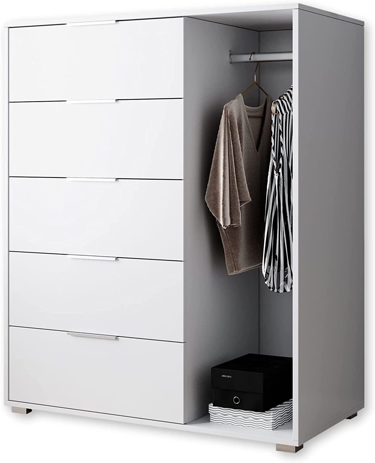 Ausführung Front und Korpus: Weiß Melamin **Ausstattung** 5 Schubkästen 1 offenes Kleiderfach mit 1 Kleiderstange **Lieferumfang** 1 Schrankkommode ohne Dekoration