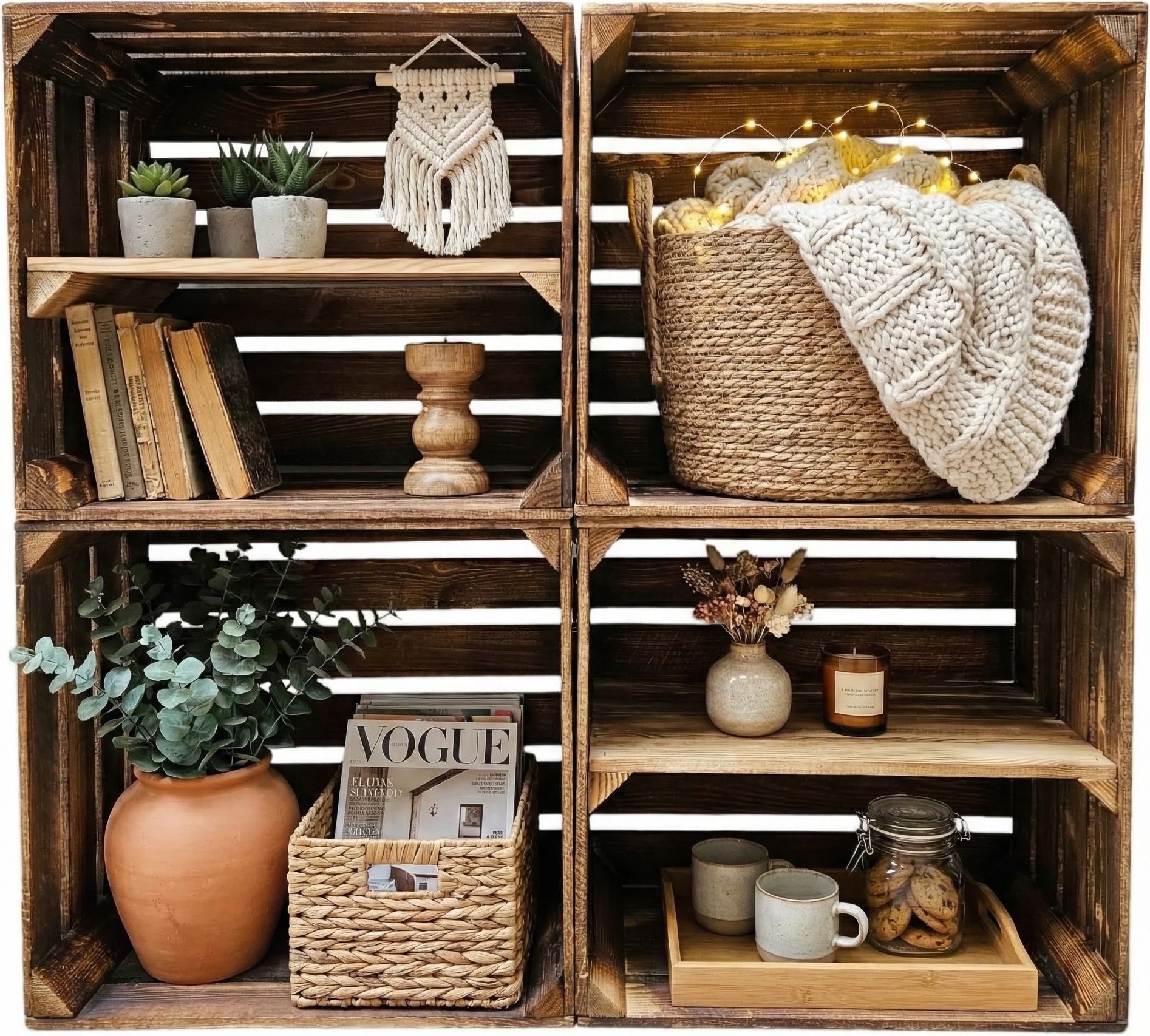 | Lieferumfang | 2x Obstkiste geflammt, 2x Obstkiste geflammt mit Ablage längs verschraubt |