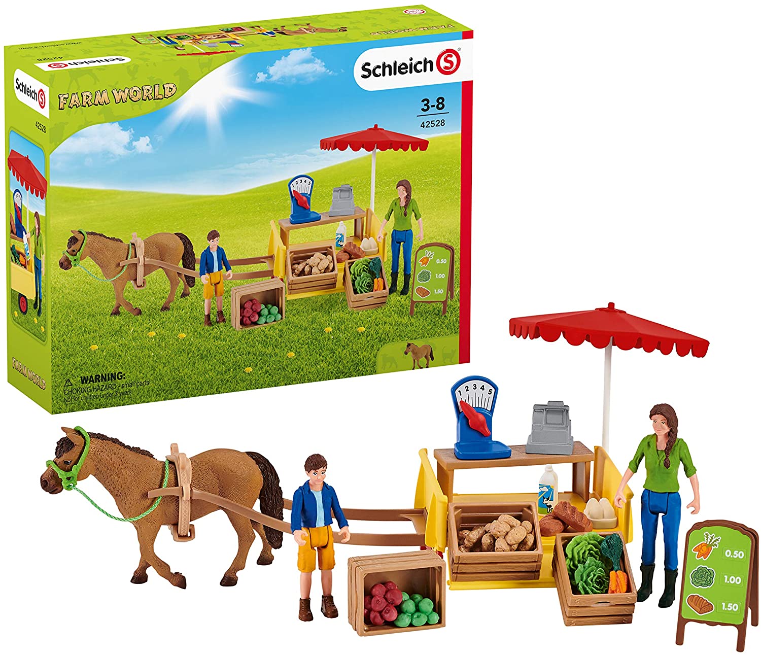 FW Ben und seine Mutter Laura beladen den Mobilen Farm Stand von Schleich® FARM WORLD mit frischen Produkten direkt von ihrem Bauernhof. Saftige Äpfel, frisch gelegte Eier, knackiger Salat, Kartoffeln vom Feld, kühle Kuhmilch und knuspriges Brot finden auf ihrem Wagen platz. Nachdem sie alles aufgeladen haben, spannen sie ihr fleißiges Pony Poppy vor die Wagen und fahren los, um ihre Waren zu verkaufen. Ob sie wohl genügend Äpfel dabei haben? Die Ware kann je nach Bedarf auf dem Farm Stand platziert werden und der Zeiger an der Waage lässt sich beliebig verstellen. Das Set bietet eine Vielzahl an Spielmöglichkeiten und passt ideal zum FW Bauernhaus 42407. Wissenswertes Ben hat immer frische Karotten als Belohnung für sein Poppy dabei! Abmessungen 34 x 23 x 12 cm (B x T x H) Altersempfehlung 3-8 Jahre - Die Schleich® Figuren sind detailgetreu modelliert und stehen für pädagogisch wertvolles Spielen. - Der Artikel gehört zur Themenwelt FARM WORLD und ist für Kinder zwischen 3-8 Jahren geeignet. - Das Set enthält 2 Figuren, ein Pferd und jede Menge Zubehör! - Das Pferd lässt sich ausspannen und durch andere Schleich® Pferde ersetzen! Inhalt 1x Bäuerin, 1x Junge, 1x Dartmoor Pony Stute, 1x Bauchgurt, 1x Schnur, 1x Halfter, 1x Zugstange, 1x Anhänger, 2x Apfel, 2x Brot, 2x Salat, 2x Kartoffel, 1x Karotte, 1x Werbeaufsteller, 1x Sonnenschirm, 1x Waage, 1x Milchflasche, 1x Eier, 3x Holzkiste, 1x Kasse, 1x Bank Achtung! Verschluckbare Kleinteile. Erstickungsgefahr.