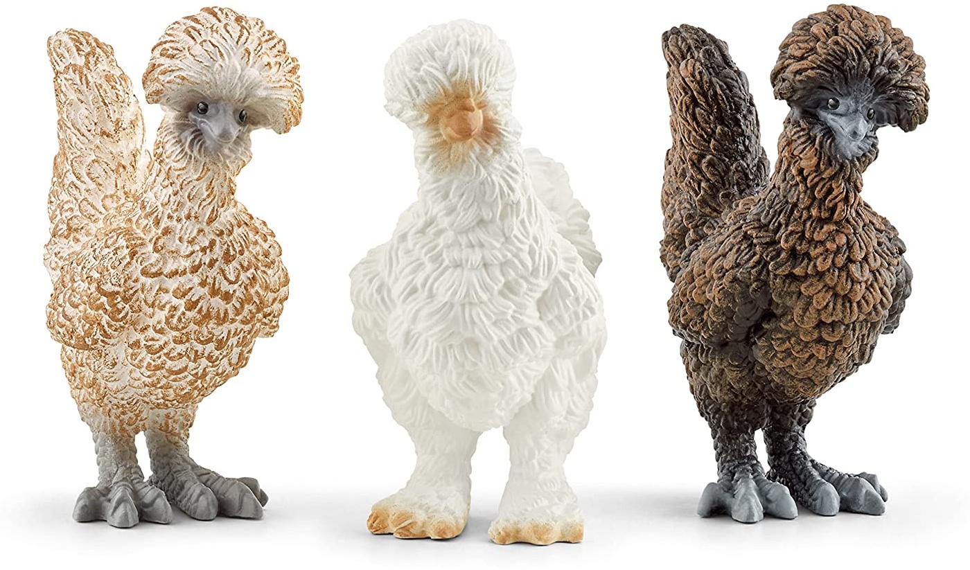 - Die Schleich Farm World »Hühnerfreunde« besteht aus zwei unterschiedlichen Polnischen Hühnern und einem Seidenhuhn.