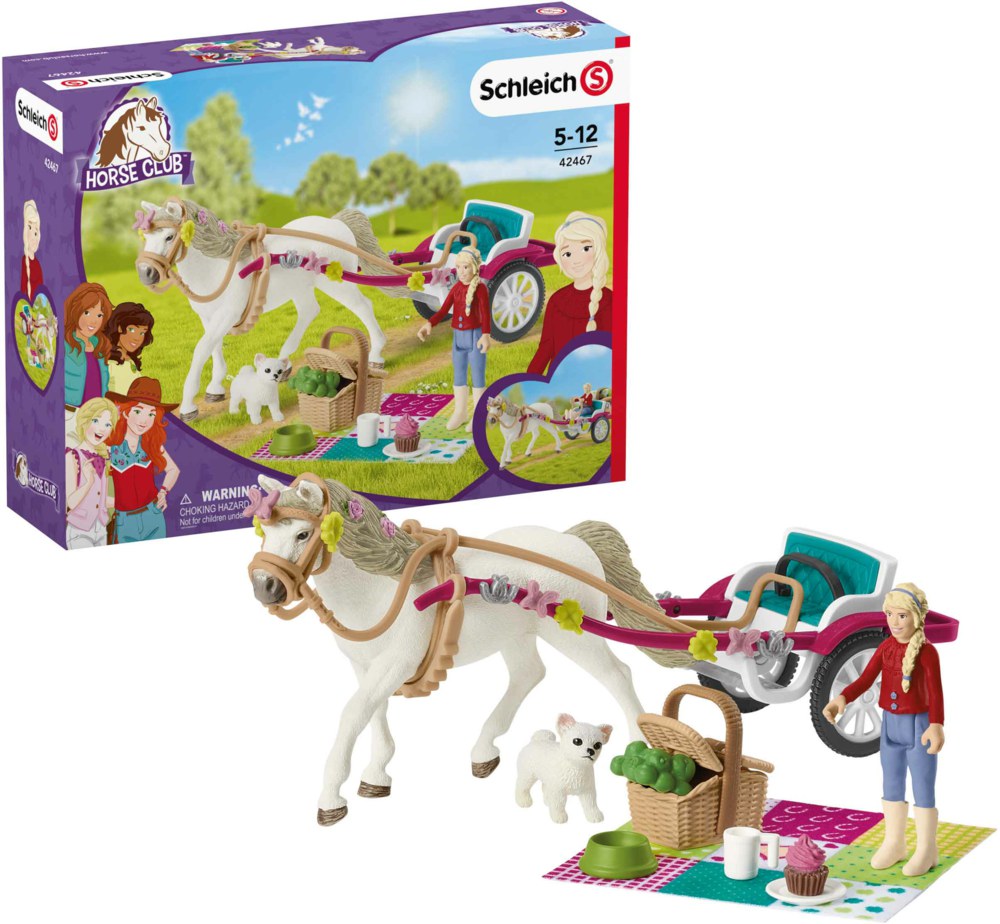 - Die Schleich® Figuren sind detailgetreu modelliert und stehen für pädagogisch wertvolles Spielen. - Clara kann sitzen, stehen und greifen! - Zaumzeug und Riemen abnehmbar! - Deko-Elemente mit Schleich® Große Pferdeshow (Art.-Nr.: 42464) kombinierbar. - Der Artikel gehört zur Themenwelt Horse Club und ist für Kinder zwischen 5-12 Jahren geeignet. Die Kutsche für die Pferdeshow von Schleich® Horse Club ist liebevoll mit Kleeblättern, Hufeisen und Schmetterlingen geschmückt. Auch an das Halfter ihres Connemara-Ponys hat Clara wunderschöne Dekoelemente gesteckt. Auf der praktischen Ablagefläche sind eine weiche Picknickdecke und ein gut gefüllter Picknickkoffer verstaut. So kann Clara während der Pferdeshow gemütlich auf der Decke sitzen, mit ihrem Chihuahua-Welpen kuscheln und aus dem Korb naschen. **Wissenswertes** Clara hat für ihren süßen Hund extra einen kleinen Napf und für ihr Pony frische Äpfel eingepackt. **Inhalt** 1x Mädchen, 1x Connemara Pony, 1x Chihuahua Welpe, 1x Kutsche mit Gurt, 1x Korb, 1x Teller, 1x Tasse, 1x Decke, 1x Cupcake, 1x Äfpel, 1x Napf, 1x Bauchgurt, 1x Zaumzeug, 1x Zügel, 6x Schmuck Hufeisen, 6x Schmuck Kleeblatt, 6x Schmuck Schmetterling, 1x Aufbauanleitung **Abmessungen** 25,0 x 7,0 x 11,5 cm (B x T x H)