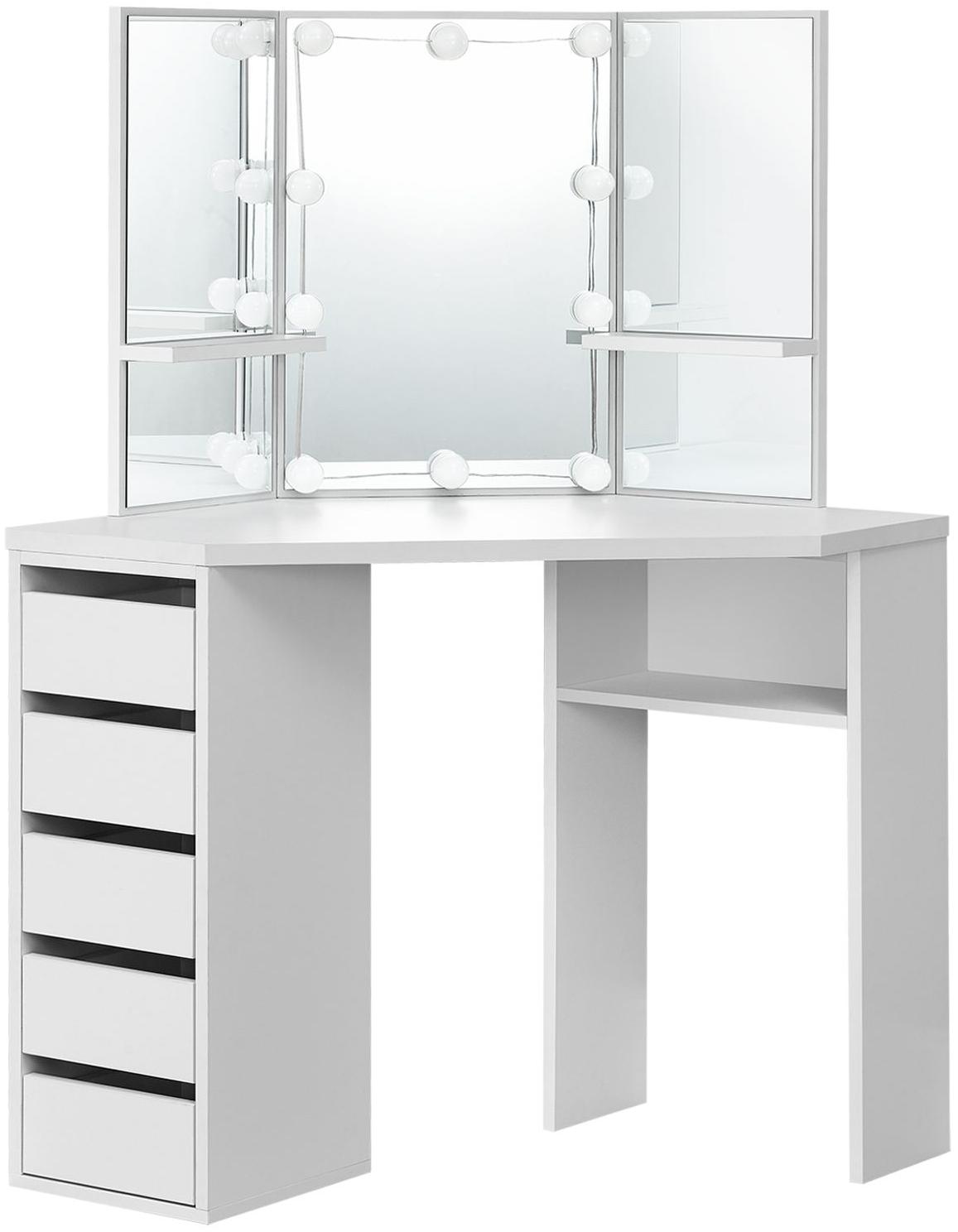 Eck-Schminktisch Nova mit Spiegel und Schubladen – stilvoll und platzsparend zugleich! Ob Styling für Schule, Uni oder Arbeit – der stilvolle Eck-Schminktisch Nova mit LED Beleuchtung erleichtert Ihnen das tägliche Styling. Und ist dazu noch sehr platzsparend! Der aus MDF-Holz hergestellte Kosmetiktisch verfügt über einen beleuchteten 3-teiligen Eckspiegel. Ihr Make-up verstauen Sie ordentlich in den 5 Schubladen und 3 Ablageflächen. Auch optisch überzeugt der bezaubernde Schminktisch mit Beleuchtung im modernen Design. Mit kratzfester Lackierung erstrahlt der weiße Schminktisch in märchenhafter Eleganz. Durch seine gradlinigen Formen harmoniert der Frisiertisch ideal mit vielen Einrichtungsstilen im Schlaf- und Jugendzimmer. **Produktmerkmale:** - Moderner Eckschminktisch mit Beleuchtung - LED Lichterkette - Platzsparend für Ecke - 3-teiliger Spiegel für optimalen Rundumblick beim Styling - Viel Stauraum mit 5 Schubladen & 3 Ablageflächen - Stabil & langlebig aus MDF-Holz für einen langjährigen Einsatz - Pflegeleicht dank lackierter Oberflächen - Platzsparend & modern Mit der Eckbauweise passt der Kosmetiktisch in jede Ecke im Schlafzimmer. Durch die geringe Stellfläche von 100 × 54 cm stellen Sie ihn platzsparend mit optimaler Raumnutzung auf – besonders vorteilhaft für kleine Zimmer. Das gradlinige Design besticht durch eine schlichte Eleganz. **Großer 3-teiliger Spiegel** Der 3-geteilte Eckspiegel - beleuchtet - besteht aus dem 66 × 44 cm mittleren Spiegel und den zwei 66 × 30 cm Seitenspiegeln. So haben Sie sich perfekt im Blick! Ideal für Jugendliche und Erwachsene, die ihr Make-up exakt auftragen wollen. Oder Hochsteckfrisuren im Handumdrehen zaubern möchten. **Optimales Schminklicht** Ob weißes Licht für das Tages-Makeup oder Warmweiß für das Party-Styling, der Schminktisch mit Beleuchtung ermöglicht Ihnen das perfekte Licht. Stellen Sie die gewünschte Farbe und Helligkeit einfach mit dem Schalter ein. Betrieben wird die sparsame Lichterkette über ein 230 Volt USB-Netzteil. **10 LED-Lampen zum Kleben** Die Lichterkette mit 10 Lampen befestigen Sie nach Belieben am Spiegel. Die Montage ist denkbar einfach. Mithilfe der doppelseitigen Klebepunkte kleben Sie die Spiegellampen schnell und leicht an den Schminkspiegel. Ideal, um Ihren Frisiertisch optisch aufzuwerten. **Ordentliche Aufbewahrung** Sie wollen Ihre Beauty- und Pflegeprodukte ordentlich und griffbereit aufbewahren? Die 5 Schubladen - je 26 × 25 cm - und die Ablagefläche unter dem Tisch bieten viel Stauraum. Zusätzlich platzieren Sie Parfumflakons und Schmuckständer auf den zwei 29 × 10 cm großen Ablagen an den Seitenspiegeln. Stabil & pflegeleicht Der robuste Kosmetiktisch besteht aus solidem MDF Holz, wodurch er stabil und langlebig ist. Somit haben Mädchen und Frauen lange Freude mit ihrem neuen Eck Schminktisch. Die lackierten Oberflächen sind stoß- und kratzfest und lassen sich gut mit einem feuchten Tuch von Staub bzw. Kosmetik befreien. **Technische Daten:** - Material Kommode: MDF Holzfaserplatten - Material Lampen: Kunststoff - Material Drähte Beleuchtung: Kupferdraht - Farbtemperatur Licht: Warmweiß, Naturweiß, Weiß - Farbe Frisierkommode, Lampen: Weiß - Anzahl Spiegelflächen: 3 - Anzahl Schubladen: 5 - Anzahl Ablageflächen: 3 - Anzahl Lampen LED: 10 **Leistung | Stromversorg:** - Lichter: 4 Watt | 230V USB-Netzteil - Lichtstrom: 223 lm - Farbtemperatur: 3000 - 8000 K - Energieeffizienzklasse: G **Abmessungen (ca. -Angaben):** - Schminkkommode: 100 × 53 × 140 cm (LxBxH) - Tischhöhe: 78 cm - Mittlerer Spiegel: 60 × 41 cm (H x B) - Seitenspiegel: 40 × 28 cm (H x B) - Schublade: 26 × 25 cm (L x B) - Ablagen am Schminkspiegel: 30 × 7,5 cm (L x B) - Tischdiagonale: 114 cm - Größe Lampe: 4 x 6 cm **Hinweise zur Lichtquelle:** Das Produkt enthält eine LED-Beleuchtung. Die LED-Beleuchtung dient ausschließlich der Deko-Beleuchtung und ist nicht für andere Anwendungen geeignet. Die Leuchtmittel sind nicht tauschbar, aber entnehmbar. Die LED-Beleuchtung ist in mehreren Weiß-Tönen einstellbar, aber nicht dimmbar. Die LED-Beleuchtung muss nach der Waste Electrical and Electronic Equipment-Richtlinie und Elektro G entsorgt werden. **Lieferumfang:** - 1 x Eckschminktisch mit Spiegel - 1 x LED-Lichterkette mit USB-Anschluss - 1 x Anleitung - Das Produkt wird gut verpackt per Paketdienst geliefert.