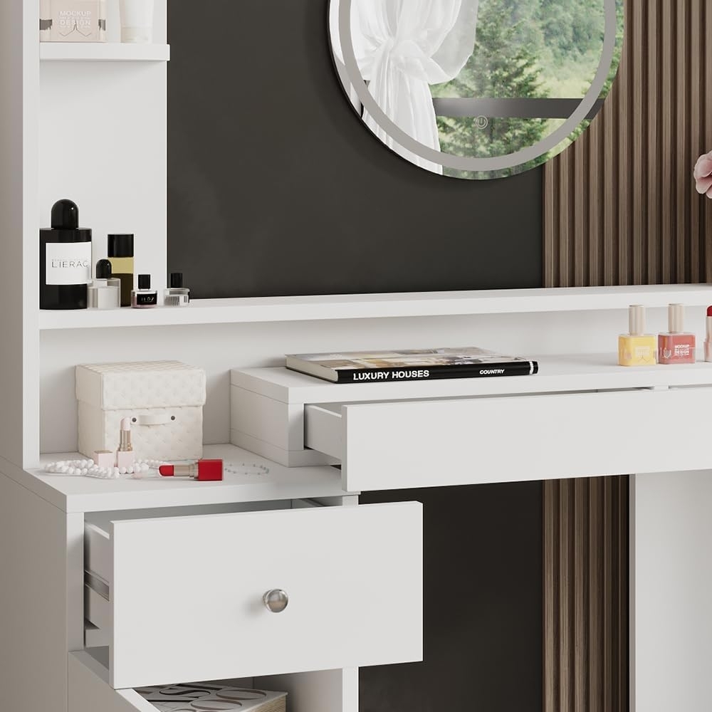 | Beschreibung | Der Vicco Schminktisch Garant in Weiß kombiniert elegantes Design mit praktischen Funktionen. Mit einem geschlossenen Regal, einer Tür, drei Schubladen und zwei offenen Fächern bietet er ausreichend Stauraum für Ihre Kosmetikartikel. Der LED-Leuchtspiegel sorgt für eine optimale Ausleuchtung, sodass Sie Ihr Make-up perfekt auftragen können. Dieser Schminktisch verwandelt Ihr Schlafzimmer in einen stilvollen Ort für Ihre Schönheitsroutine. **Highlights** - LED-Leuchtspiegel für optimale Ausleuchtung - Viel Stauraum durch geschlossene Regale und Schubladen - Elegantes Design für jedes Schlafzimmer - Pflegeleichtes Material aus MDF - Touch-Switch für einfache Bedienung der Beleuchtung **Produkteigenschaften** - Farbe: Weiß - Abmessungen: 116 x 137 x 39,5 cm (BxHxT) - Artikelgewicht: 29,01 kg - Artikelgewicht inkl. Verpackung: 30 kg **Lieferumfang** - Schminktisch - LED-Lichterkette - Montageanleitung - Montagematerial |
