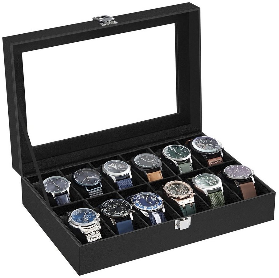 - **Für Uhrenliebhaber:** Jeder Uhrensammler braucht eine Uhrenbox, um seine Zeitmesser vor Staub und Kratzern zu schützen. Dieser elegante Kasten mit 12 Uhrenkissen bewahrt Ihre Lieblingsstücke nicht nur vor schädlichen Einflüssen, sondern hebt zudem ihre Einzigartigkeit hervor - **Betont die Eleganz Ihrer Uhren:** Transparenter Glasdeckel, schwarzes Innenfutter, schwarzer PU-Bezug, glänzender Metallverschluss – Durch diesen Uhrenkasten geben Sie Ihrer Uhrensammlung einen Ehrenplatz sowie einen optimalen Aufbewahrungsort - **Alle Uhren auf einen Blick:** Ihr Outfit sitzt wie angegossen. Jetzt fehlt nur noch die passende Uhr. Werfen Sie nur einen kurzen Blick durch den transparenten Glasdeckel dieser Uhrenbox und greifen Sie schnell auf die benötigte Uhr zu - **Ein Rundumschutz für Ihre Kostbarkeiten:** Dank der Uhrenkissen und des Samt-Innenfutters der Schatulle lassen sich Ihre Lieblingsuhren optimal in den 12 Fächern verstauen und werden zudem gut vor Staub, Kratzern und Stößen geschützt - **Was Sie bekommen:** Eine Uhrenbox, die über 12 Fächer, einen Glasdeckel, herausnehmbare Uhrenkissen, Samtfutter und einen Metallverschluss verfügt. Möchten Sie Ihre Uhren ordentlich verstauen und gleichzeitig stilvoll präsentieren? Dann gönnen Sie sich dieses Kästchen! - **Der Schlüssel zum Erfolg liegt im Detail:** Diese Uhrenbox von SONGMICS ist bis ins kleinste Detail durchdacht: Um Ihre Uhren vor fremdem Zugriff zu schützen, wurde sie mit einem Schloss versehen; darüber hinaus haben wir die Trennwände zwischen den Uhrenfächern verstärkt, was Ihren Uhren einen stabilen Halt gibt. - **Hinter einer schlichten Fassade versteckt sich ein Traumhaus für Uhren:** Der Uhrenkasten sieht schlicht und zurückhaltend aus, aber wenn Sie den Deckel aufklappen, werden Sie von seinem luxuriösen Innenleben überrascht sein: Die Box ist mit einem weichen Samt-Innenfutter ausgekleidet und auch die Uhrenkissen sind mit Samt überzogen. Hier finden Ihre Uhren oder Armbänder ein geeignetes Zuhause. Ferner können Sie dank der abnehmbaren Uhrenkissen auch andere Schmuckstücke in diesem Kasten verstauen, was ein weiteres Highlight dieser Box darstellt. - **Diese Investition lohnt sich:** Die Uhrenbox schützt Ihre kostbaren Uhren vor Schmutz, Kratzern, Beschädigungen etc. So sparen Sie sich die Kosten für eine Reparatur oder Wartung Ihrer Uhr. Es besteht also kein Zweifel daran, dass der Kauf einer Uhrenbox eine sinnvolle Investition ist. **Produktdetails:** - Farbe: schwarz - Material: MDF, PU, Papier, Samt, Glas - Gesamtmaße: 30 x 21 x 8,5 cm (L x B x H) - Maße pro Uhrenfach: 7x4,8 cm - Maße pro Uhrenkissen: 7 x 3,5 x 4,8 cm (B x H x T) - Gewicht: 1,12 kg **Lieferumfang:** - 1 x Uhrenbox