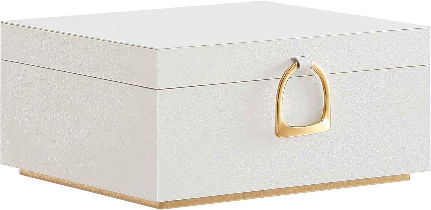 - Die Schmuckbox besticht durch ihre stilvolle Weiß-Gold-Farbkombination und den speziell geformten Metallgriff, der ihr einen modernen Look verleiht.