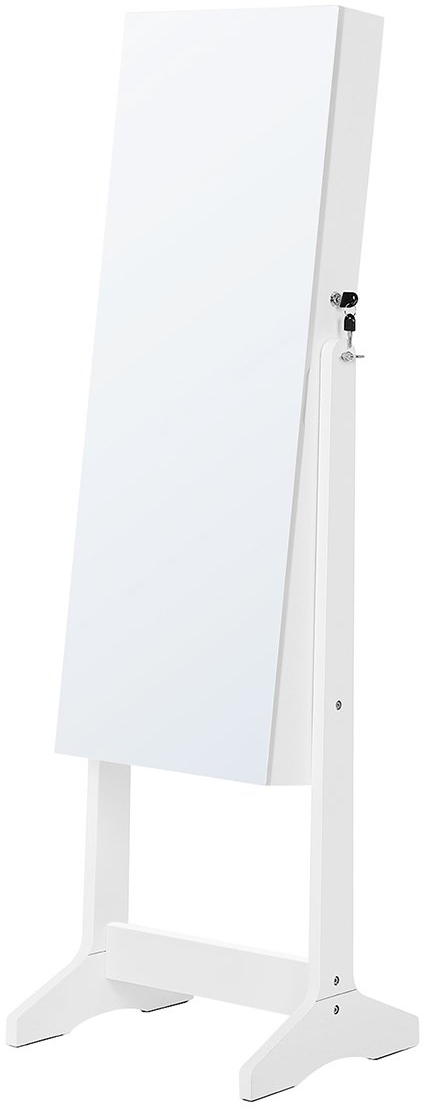 - **Viel Platz für Schmuck:** 108 Halterungen und 36 Löcher für Ohrringe, 36 Haken für Ketten, 39 Steckplätze für Ringe, 1 Stange für Armbänder, 4 Ablagen inklusive einer hohen Ablage für große Kosmetika – chaosfreie Schmuckaufbewahrung! - **Auch für Kosmetika? Ja!** Im Inneren des Schranks befinden sich 2 pflegeleichte Kosmetik-Organizer aus Kunststoff, welche mit 3 tiefen Fächern für Pinsel, 2 weiteren Fächern für Puder und 8 Halterungen für Lippenstift ausgestattet sind - **Entzückender Anblick:** Bewundern Sie sich von Kopf bis Fuß in dem rahmenlosen Ganzkörperspiegel dieses Schmuckschranks! Dieser spiegelt nicht nur Ihren guten Geschmack wider, sondern auch Ihr gutes Händchen für stylishe Einrichtungsgegenstände - **1, 2, 3, fertig!** Der Korpus dieses Schmuckschranks kommt bereits vormontiert bei Ihnen an. Sie müssen einfach nur die beiden Standfüße anbringen und den Schrank dann mit Ihrem Schmuck befüllen - **Ein prima Geschenk für...** den Geburtstag Ihrer Freundin, Muttertag oder Weihnachten! Dieser hochwertige Schmuckschrank aus robustem MDF sorgt für strahlende Augen! !\[JJC002W01\]( **Perfekt gestylt aus dem Haus:** Sie haben Ihr Outfit bereits ausgewählt, doch es fehlt noch das gewisse Etwas? Öffnen Sie einfach die Tür dieses Schmuckschranks, um das i-Tüpfelchen für Ihren Look zu finden! Die goldenen Ohrringe und das süße Armband mit Blumen würden doch perfekt zu Ihrem Kleid passen, oder? Halt! Vergessen Sie nicht, dass sich auch Ihr Make-up in diesem Schmuckschrank befindet. Komplettieren Sie also Ihren Look mit dem richtigen Schmuck und der richtigen Schminke und bewundern Sie das Ergebnis dann in dem praktischen Ganzkörperspiegel! **Ein Ort, an dem sich Ihr Schmuck geborgen fühlt:** Lassen Sie Ihren Schmuck und Ihr Make-up nicht in dunklen Schubladen versauern! In diesem Spiegelschrank können Sie Ihre Schätze wie in einer Vitrine verstauen und sie mithilfe des Schlosses und der beiden Schlüssel vor Staub sowie vor Langfingern schützen. Perlenketten, Armbänder, Ohrringe und Schminkutensilien werden sich in diesem raffinierten Schmuckschrank sofort wohlfühlen! **Produktdetails:** - Farbe: Weiß - Material: MDF (Mitteldichte Faserplatte) - Größe insgesamt: 41,2 x 36,5 x 152 cm (L x B x H) - Größe Schrankkorpus: 37,5 x 9,7 x 108 cm (L x B x H) - Gewicht: 11,4 kg **Lieferumfang:** - 1 x Schmuckschrank - 2 x Schlüssel - 1 x Zubehörpaket - 1 x Kippschutz - 1 x Anleitung **SONGMICS Hinweise:** - Kindern ist es aus Sicherheitsgründen untersagt, auf das Produkt zu klettern oder damit zu spielen. - Bitte befestigen Sie dieses Produkt mit dem beiliegenden Kippschutz an der Wand.