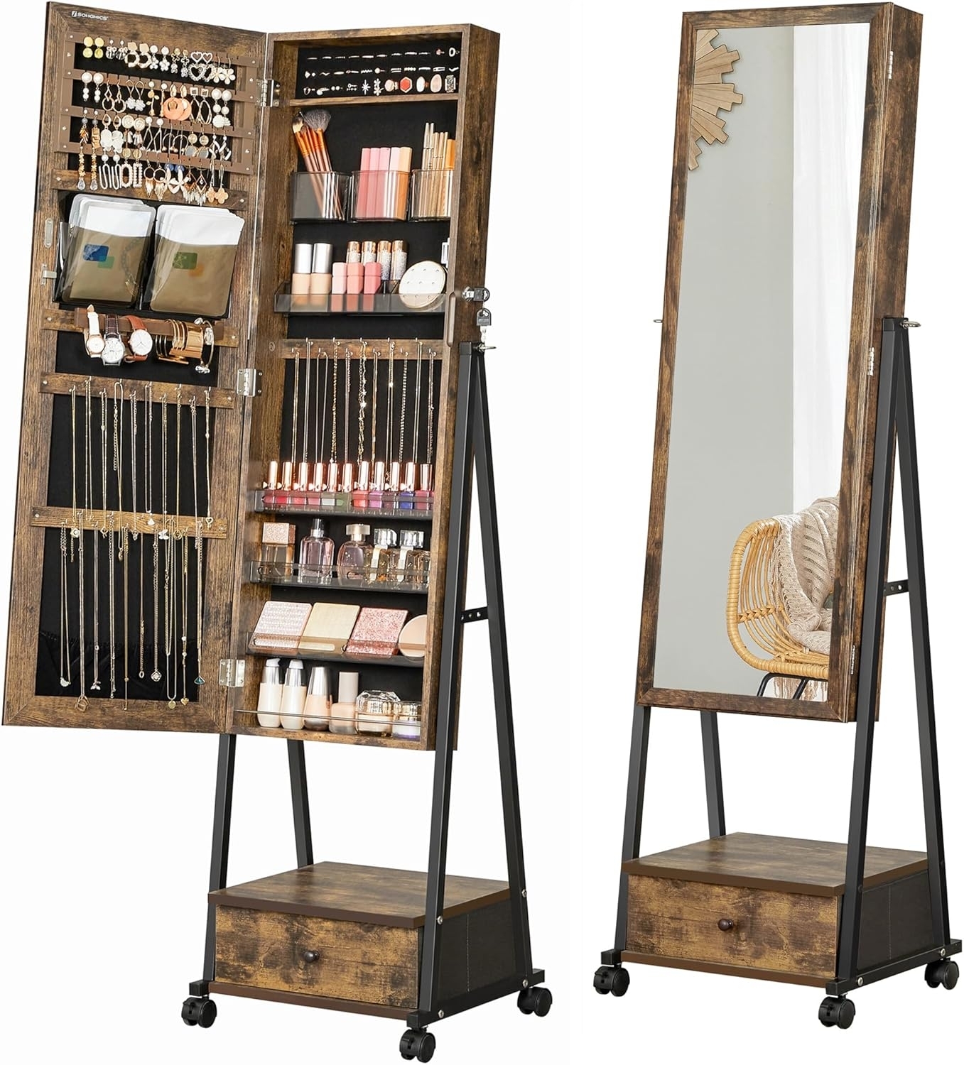 in SchmuckschränkeSongmics SchmuckschrankGanzkörperspiegel, Spiegelschrank, abschließbarer Schmuckorganizer mit Schublade, Rollen, 41,5 x 37 x 152,5 cm, vintagebraun-schwarz