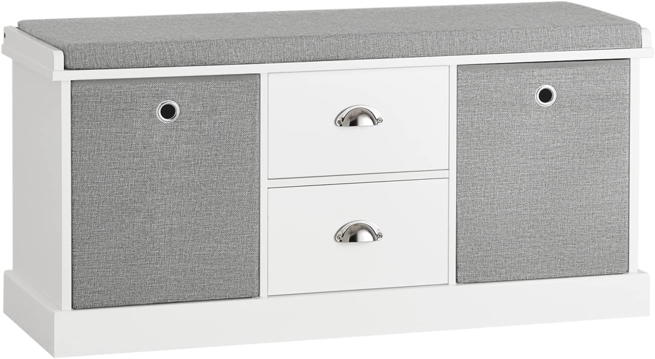 Die Schuhbank FSR66-HG kombiniert Funktionalität und stilvolles Design. Mit einer Sitzfläche und zwei Schubladen bietet sie ausreichend Stauraum für Schuhe und Spielzeug. Gefertigt aus MDF und ausgestattet mit einem Vlieskorb, sorgt das Sitzkissen für zusätzlichen Komfort. Die Bank hat eine Belastbarkeit von bis zu 150 kg und wiegt ca. 23,3 kg. **Highlights** - Sitzfläche mit Kissen für erhöhten Komfort - Zwei Schubladen für zusätzlichen Stauraum - Belastbarkeit bis 150 kg - Stilvolles Design in Weiß - Praktische Maße für jeden Eingangsbereich **Produkteigenschaften** - Material: MDF, Korb aus Vlies - Produktmaße: BHT ca. 100 x 50 x 35 cm - Paketmaße: 108 x 20 x 41 cm - Gewicht: ca. 23,3 kg **Lieferumfang** - 1 x Schuhbank - 1 x Anleitung - 1 x Zubehörbeutel