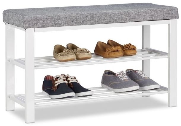 Die Relaxdays Schuhbank mit Polster vereint Funktionalität und Stil. Sie bietet einen bequemen Platz zum An- und Ausziehen Ihrer Schuhe und verfügt über 2 Ebenen, die Platz für 6 bis 8 Paar Schuhe bieten. Das graue Design fügt sich harmonisch in jeden Raum ein. Die Metallstangen sind mit Bodenschonern ausgestattet, um Kratzer zu vermeiden, und die Reinigung erfolgt mühelos mit einem feuchten Lappen. **Highlights** - Kombination aus Schuhregal und Sitzbank - Gemütliches Sitzpolster mit Stoffbezug - Platz für 6 bis 8 Paar Schuhe auf 2 Ebenen - Bodenschoner verhindern Kratzer - Dekoratives Design in Grau **Produkteigenschaften** - Abmessungen: H x B x T: 50 x 81 x 32 cm - Fläche je Ablage: B x T: 77 x 26 cm - Material: Stoff, pulverbeschichtetes Metall, MDF - Gewicht: ca. 6,6 kg **Lieferumfang** - 1 x Schuhbank in Einzelteilen - Mit Montagematerial - Mit Anleitung - Dekoartikel sind im Lieferumfang nicht enthalten