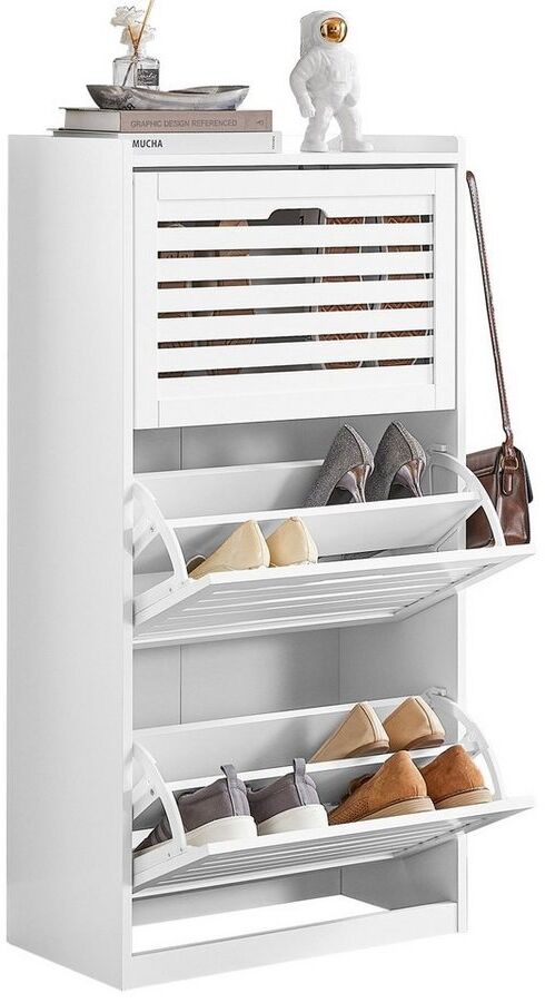 - Der SoBuy FSR108-W Schuhschrank bietet mit drei Klappen und sechs Ablageflächen ausreichend Platz für eine Vielzahl von Schuhen in unterschiedlichen Größen und Ausführungen.