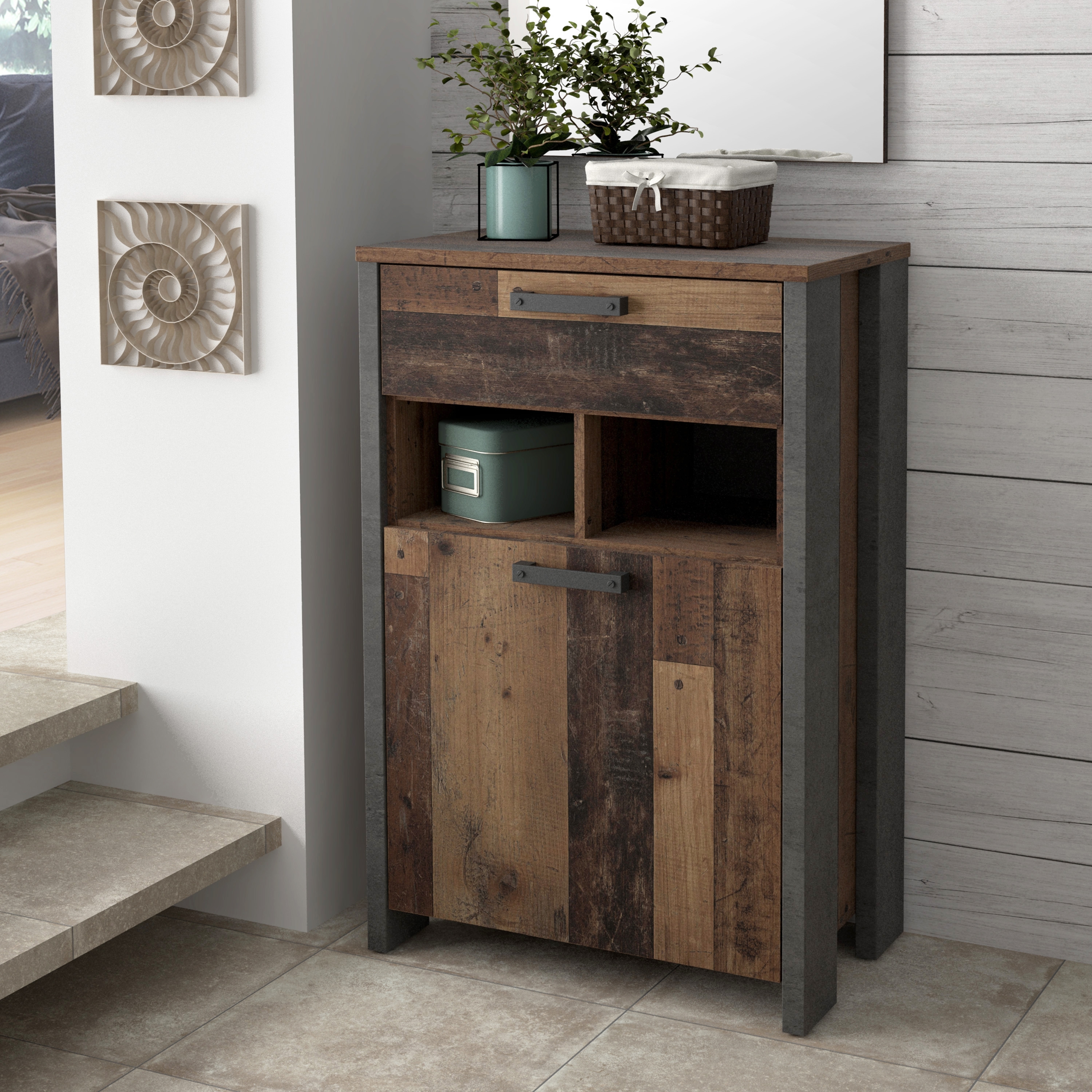 Der Schuhschrank Kommode CLIF 1-trg. in der Optik Old Wood Vintage von Forte ist nicht nur ein schickes Möbelstück, sondern erfüllt auch eine wichtige Funktion in Ihrem Flur. Mit einer Tür, einer Schublade und einem offenen Fach bietet er ausreichend Platz für Ihre Schuhe und Accessoires. Die Maße betragen 67 x 105,5 x 41,5 cm (B/H/T). Das Dekor Old Wood Vintage mit dunkelgrauer Betonoptik verleiht dem Schrank einen modernen und zugleich gemütlichen Look. Die Lieferung erfolgt zerlegt zur Selbstmontage. **Highlights** - Schuhschrank Kommode mit einer Tür, einer Schublade und einem offenen Fach - Optik: Old Wood Vintage mit dunkelgrauer Betonoptik - Maße: B/H/T 67 x 105,5 x 41,5 cm **Produkteigenschaften** - Material: Spanplatte beschichtet - Kunststoffgriffe in Vintage Black - 1 Einlegeboden für zusätzlichen Stauraum **Lieferumfang** - Schuhschrank Kommode CLIF 1-trg. in der Optik Old Wood Vintage von Forte - Zerlegt zur Selbstmontage