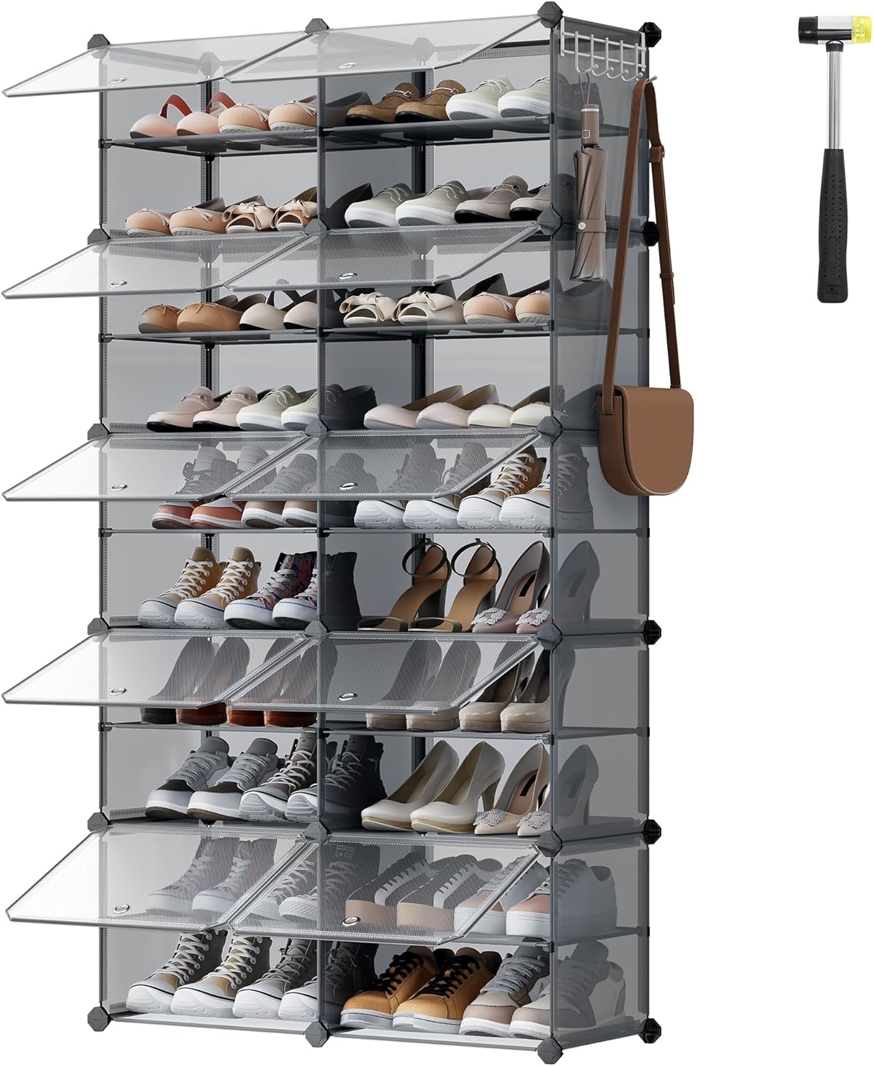 Dieser SONGMICS Schuhregal bietet mit 10 Fächern ausreichend Platz für bis zu 40 Paar Schuhe und eignet sich ideal für Flur, Schlafzimmer oder Eingangsbereich. Mit einem stabilen Stahlrahmen und Kunststoffplatten ist das Regal robust und jedes Fach bis zu 5 kg belastbar. Die transparenten Türen sorgen für eine gute Belüftung und sind leicht zu reinigen. Der einfache Aufbau ohne zusätzliches Werkzeug macht es besonders benutzerfreundlich. **Highlights** - 10 Fächer für bis zu 40 Paar Schuhe - Robuster Stahlrahmen mit Kunststoffplatten - Einfacher Auf- und Abbau ohne Werkzeug - Staub- und wasserdicht mit transparenten Türen - Flexibel in 2 oder 3 Reihen aufstellbar **Produkteigenschaften** - Maße (HxBxT): 30 x 40 x 30 cm pro Fach - Belastbarkeit: jedes Fach bis zu 5 kg - Mit seitlichen Haken zum Aufhängen von Taschen oder Leinen - Kippschutz für zusätzliche Sicherheit - Pflegeleicht, lässt sich mit einem feuchten Tuch reinigen **Lieferumfang** - Schuhregal mit 10 Fächern - Metallhammer mit Gummikopf - Kippschutz - Montageanleitung