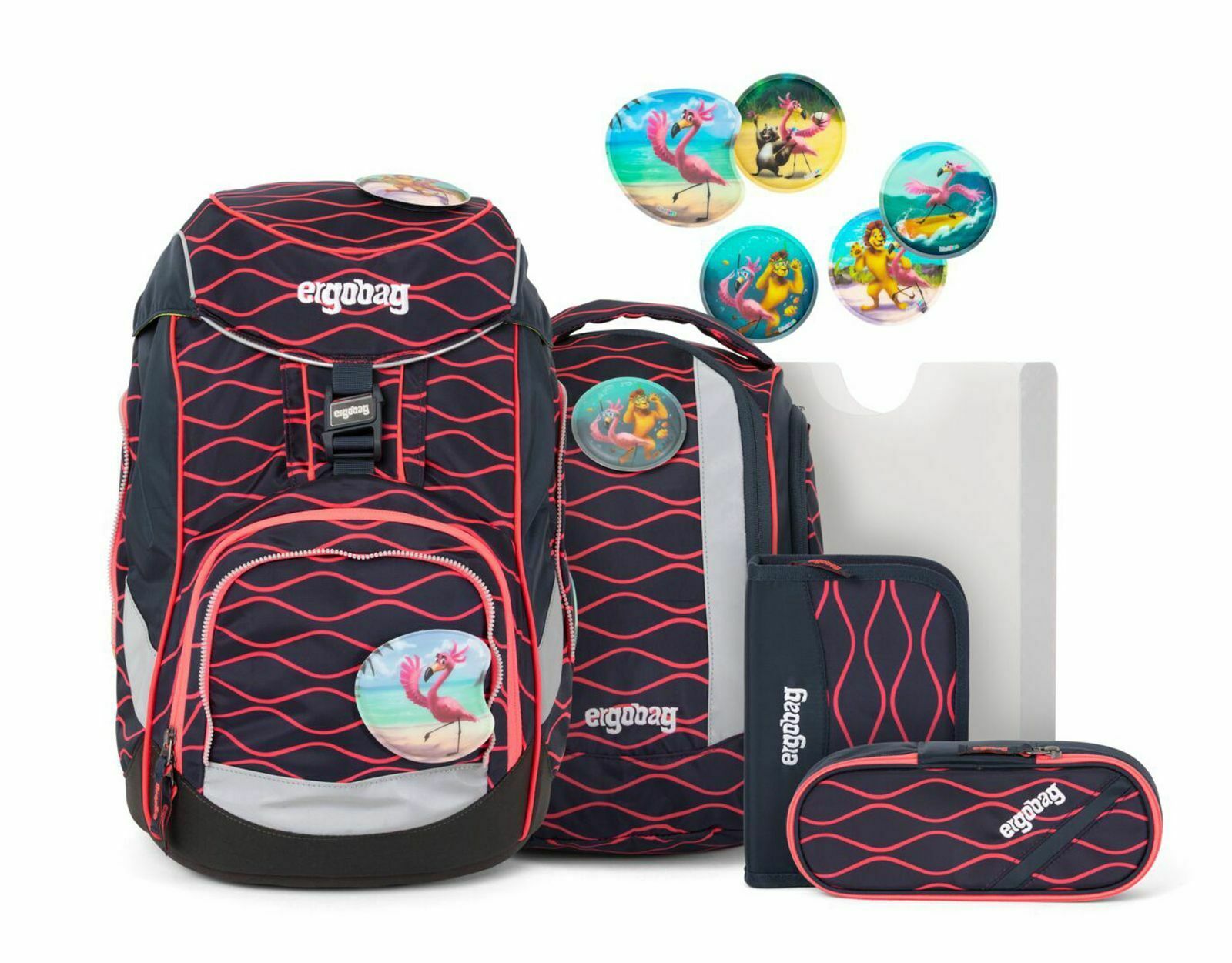 - ergobag Schulrucksack pack (blau mit pinken Wellen) - Der flexible ergobag pack bietet Ihnen die optimale Kombination innovativer Trekking Technologie mit den Besonderheiten eines Schulrucksacks. Der Schulrucksack ist aufgrund seines ergonomischen Aufbaus mit einem gepolsterten Rückenteil, ergonomischen Schulterträgern, einem verstellbaren Brustgurt und einem verstellbaren Hüftgurt, optimal auf die Anatomie Ihres Schulkindes angepasst. Mit der Rückenanpassung durch das "Your-Size-System" kann der ergobag pack Schulrucksack perfekt an die Rückenlage des Kindes angepasst werden und ist geeignet für Schulkinder von 100-150 cm Körpergröße. Durch einen magnetischen Verschluss lässt sich der ergobag pack mit dem "Einfinger-Griff" kinderleicht öffnen. Ein Tunnelzug-Verschluss sorgt für einen zusätzlichen Kompressionseffekt. Eine geräumige Fronttasche bietet Platz für Trinkflasche und Brotdose. Der standfeste Boden mit seiner stabilen Bodenwanne aus einem Guss, bietet Schutz vor Nässe. Eine Vielzahl reflektierender Elemente bietet Ihrem Schulkind zusätzliche Sicherheit im Straßenverkehr. - Sportrucksack - separat zu tragen oder ganz einfach am Schulrucksack zu fixieren - Federmäppchen - komplett bestückt mit hochwertigen Schulmaterialien (22tlg.), inklusive 6 Jumbo-Malstifte, Stundenplan, Lineal, Radiergummi, Anspitzer und Co. - Schlamperrolle - für Schere, Kleber und die kleinen Dinge im Schulalltag - Kletties - austauschbare Kletties zur individuellen Gestaltung des Schulrucksacks (Bitte beachten Sie, dass die Kletties von der Darstellung abweichen können) - Heftebox - A4 ganz leicht von oben zu bedienen, sorgt für Ordnung und schützt die Hefte und Unterlagen - Nachhaltigkeit und verantwortungsvoller Umgang mit Ressourcen - Material zu 100% aus recycelten PET-Flaschen hergestellt