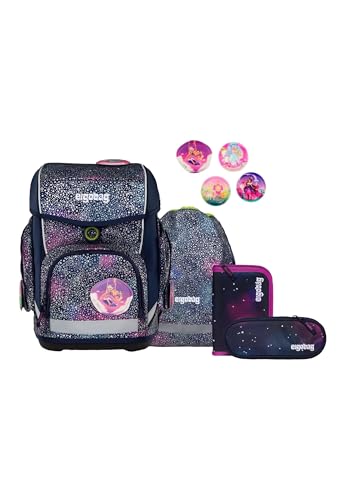 ergobag cubo Setergonomischer Schulrucksack 5-teilig, für 1. Klasse Grundschule, inkl. Sportbeutel und gefülltem Federmäppchen, individuell gestaltbar, standfest, wasserdicht, Reflektoren, aus 27,7 recycelten PET-Flaschen