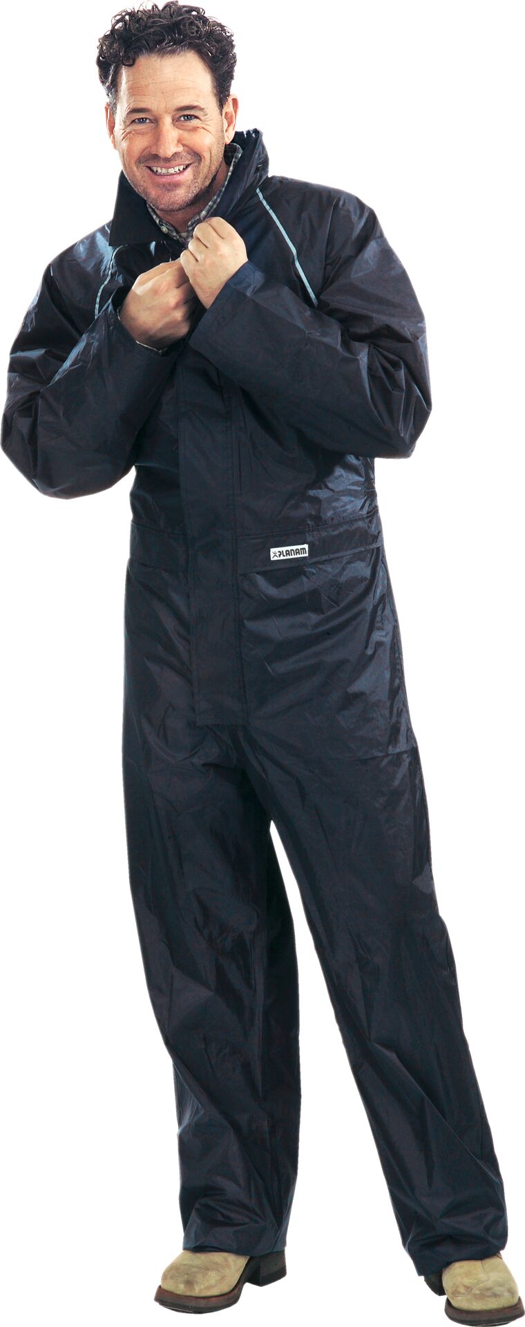 - Der Regenoverall AQUA besteht aus leichtem Polyestergewebe mit einer wasserdichten PVC-Beschichtung und verklebten Nähten für umfassenden Nässeschutz.