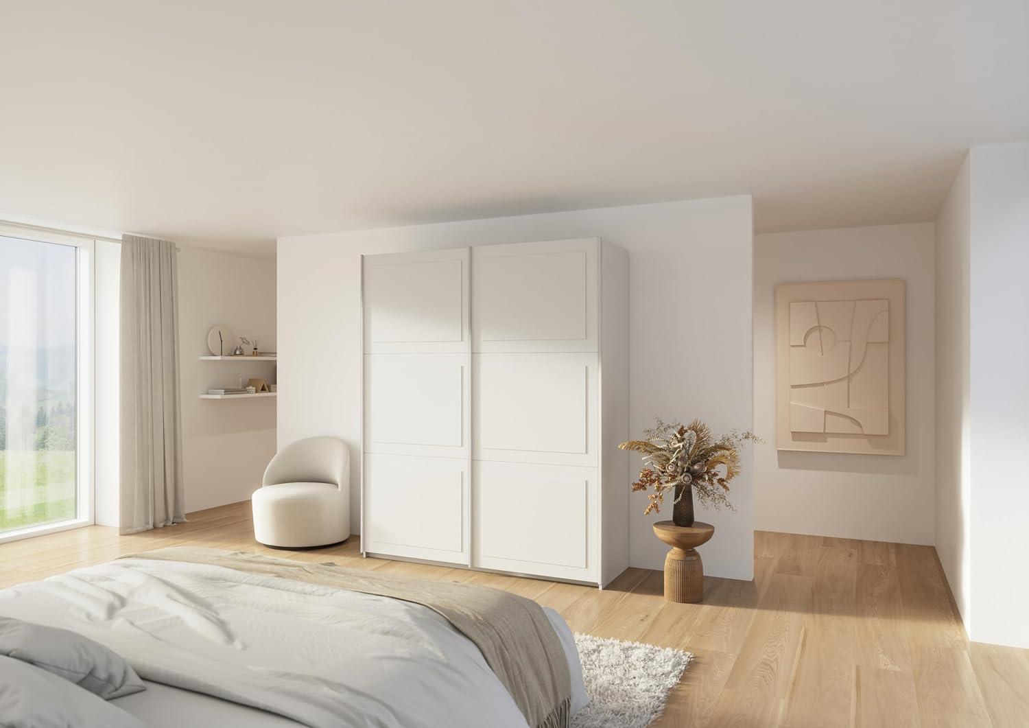 Der Schwebetürenschrank »Ruja« von Rauch Möbel vereint Funktionalität und stilvolles Design im Landhausstil. Mit den Maßen 175 x 210 x 59 cm bietet er ausreichend Stauraum für Ihre Kleidung. Die alpinweißen Türen mit Kassettenfronten schaffen eine gemütliche Atmosphäre in Ihrem Schlafzimmer. Ausgestattet mit zwei höhenverstellbaren Kleiderstangen und zwei Einlegeböden, ermöglicht er eine individuelle Organisation Ihres Stauraums. Hergestellt in Deutschland aus zertifiziert nachhaltigen Materialien. **Highlights** - Schwebetüren für platzsparende Nutzung - Höhenverstellbare Kleiderstangen für flexible Aufbewahrung - Zwei Einlegeböden zur individuellen Raumgestaltung - Alpinweißes Design für eine helle und freundliche Atmosphäre - Made in Germany aus nachhaltiger Produktion **Produkteigenschaften** - Maße (BxHxT): 175 x 210 x 59 cm - Material: Holzwerkstoff - Lieferzustand: Zerlegt, einfache Montage **Lieferumfang** - 1 Kleiderschrank - 2 Kleiderstangen - 2 Einlegeböden - Farbe: Alpinweiß