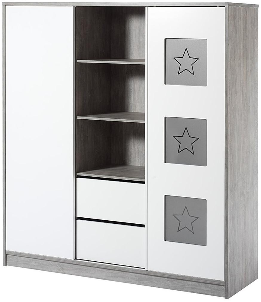 Ein Motiv zum Träumen bietet das Kinderzimmer Eco Star. Die praktischen Schiebetüren sorgen für eine platzsparende Raumgestaltung. Die passende textile Ausstattung \"Sternchen grau\" rundet den Gesamteindruck harmonisch ab. **Produktdetails:** - Farbe: Driftwood / weiß - Material: Buche massiv, Melamin Dekor - Maße: Breite x Tiefe x Höhe 167 x 54 x 183 cm - 2 Schiebetüren - 1 Schiebetür mit Stern Motiven - 2 Kleiderstange - 2 Schübe mit Selbsteinzug - 4 Böden - Mittelregal mit 3 Böden und 2 Schüben mit Selbsteinzug - Made in Germany