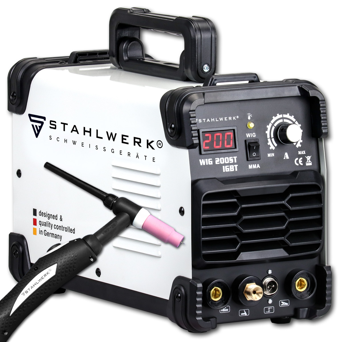 - Das Stahlwerk DC WIG 200 ST IGBT ist ein 2 in 1 Kombigerät, das sowohl WIG- als auch MMA-Schweißen mit einem maximalen Ausgangsstrom von 200 A ermöglicht.