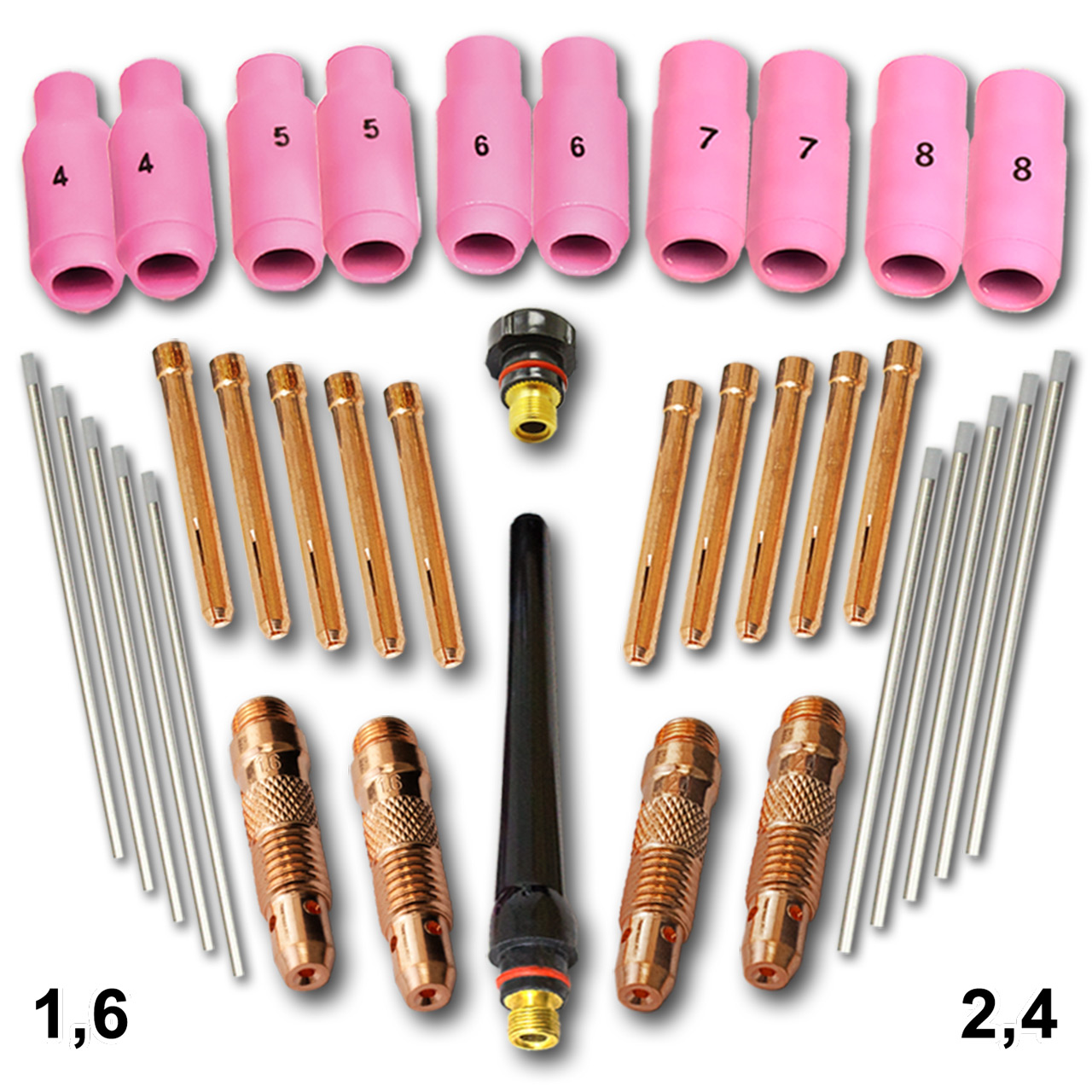 - Das Set besteht aus 36 Teilen, die speziell für alle WIG-Brenner WP-26 geeignet sind und auch mit Geräten anderer Hersteller kompatibel sind.
