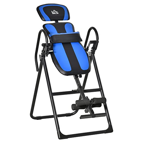 in SchwerkrafttrainerHOMCOM Inversionsbank klappbarer Schwerkrafttrainer mit zwei beweglichen Rädern eingestellt Rückenpolster Metall ABS Schwarz+Blau 132 x 71 x 145 cm