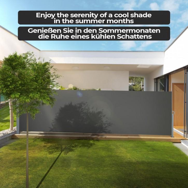 Die Jago® Seitenmarkise ist die perfekte Lösung für Ihren Garten, Balkon oder Ihre Terrasse. Mit einer Höhe von 160 cm und einer Ausziehlänge von bis zu 5 m bietet sie effektiven Schutz vor Sonnenlicht und neugierigen Blicken. Das wasserfeste und UV-beständige Material sorgt für Langlebigkeit und Komfort. Die Markise lässt sich mühelos auf- und abrollen und kann sowohl an der Wand als auch auf dem Boden montiert werden. **Highlights** - Schutz vor grellem Sonnenlicht und neugierigen Blicken - Automatischer Aufrollmechanismus im Aufrollkasten - Ausziehlänge von bis zu 5 m - Integrierter UV-Schutz im wetterfesten Material - Einfache Montage an der Hauswand oder auf dem Boden **Produkteigenschaften** - Größe: 160 cm Höhe - Ausziehlänge: bis zu 5 m - Material: wasserfestes Polyester - Farbe: Anthrazit **Lieferumfang** - Jago® Seitenmarkise - Montagematerial - Detaillierte Anleitung