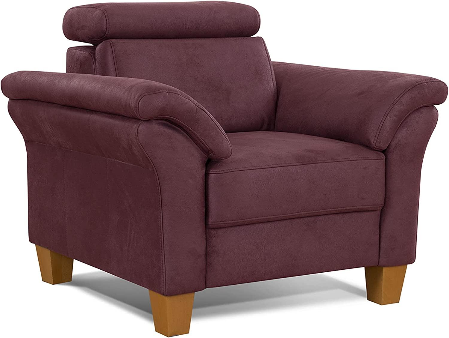 Der Cavadore Sessel Ammerland vereint modernen Landhausstil mit hohem Sitzkomfort. Ausgestattet mit einer verstellbaren Kopfstütze und eichefarbenen Holzfüßen, bietet er eine angenehme Sitzfläche dank Federkern und Wellenunterfederung. Der pflegeleichte Mikrofaser-Bezug in Wildlederoptik sorgt für eine weiche Haptik. Mit den Maßen 101 x 84-100 x 93 cm (BxHxT) ist der Sessel rückseitig echt bezogen und kann flexibel im Raum platziert werden. **Highlights** - Verstellbare Kopfstütze für individuellen Komfort - Eichefarbene Holzfüße im Landhausstil - Pflegeleichter Mikrofaser-Bezug in Wildlederoptik - Hoher Sitzkomfort dank Federkern und Wellenunterfederung - Rücken echt bezogen und frei im Raum stellbar **Produkteigenschaften** - Maße: 101 x 84-100 x 93 cm (BxHxT) - Sitztiefe: 51 cm - Sitzhöhe: 48 cm - Sitzbreite: 46 cm - Material: Mikrofaser-Bezug in Wildlederoptik - Farbe: Bordeaux (entspricht Rot) - Füße: 12 cm Höhe **Lieferumfang** - Cavadore 5402 - Sessel Ammerland mit Federkern (ohne Zierkissen) - Inklusive Kopfteilverstellung - Eichefarbene Holzfüße in Buche massiv