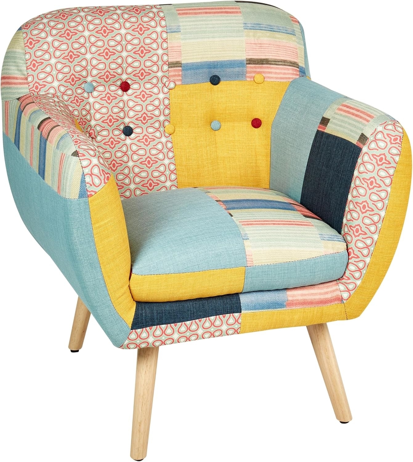 Der Sessel Polsterbezug bunt MELBY bringt fröhliche Farben in Ihr Zuhause. Mit einer breiten, bequemen Sitzfläche und einem weichen Sitzkissen bietet er hohen Komfort. Die geschwungenen Armlehnen und das stabile Gestell aus massivem Kautschuckholz sorgen für eine angenehme Sitzposition. Der pflegeleichte Patchwork-Bezug aus robustem Polyester und die Knopfverzierung auf der Rückenlehne verleihen dem Sessel einen spielerischen Charme. Ideal für Wohnzimmer, Wintergarten oder Kinderzimmer. **Highlights** - Dicke Polsterung für größten Komfort - Perfekte Kombination aus Farben und Materialien - Gut kombinierbar mit vielen Einrichtungsstilen - Hochwertiges Polster - Schutzkappen zum Schutz des Bodens **Produkteigenschaften** - Typ: Sessel - Stil: Boho - Farbe: Bunt - Material: Polyester - Zusätzliches Material: Massivholz - Füllmaterial: Schaumstoff - Gestellmaterial: Massivholz - Sitzmaterial: Stoff - Zusammenstellung: 100% Polyester - Armlehnen: Abgesenkt - Armlehnen: Ja - Schutzkappen / Filzgleiter: Ja - Muster: Patchwork - Neigbar: Nein - Sitzkonstruktion: Sprungfedern - Schaumstoffdichte: 28 kg/m3 - Höhe Armlehnen: 63 cm - Tiefe: 59 cm - Dicke der Polsterauflagen: 11 cm - Sitzhöhe: 44 cm - Breite: 64 cm - Höhe: 77 cm - Sitzfläche: 42x47 cm - Gewicht: 13 kg - Max. Belastung: 160 kg **Lieferumfang** - 1 x Sessel - Beine / Füße nicht montiert